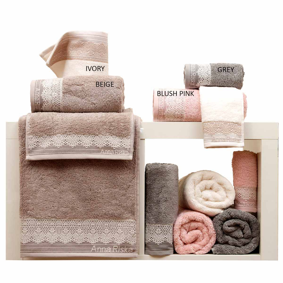 Απαλότητα που θα σας μαγέψει, αποχρώσεις που θα φωτίσουν το μπάνιο σας και σχέδιο δαντέλα στην ζακάρ μπορντούρα που θα κλέψει την παράσταση, χαρακτηρίζουν τις πετσέτες της Anna Riska. Υφασμένες από 100% βαμβάκι 600 γραμ./τ.μ. θα σας προσφέρουν ένα ποιοτικό και απαλό μπάνιο.