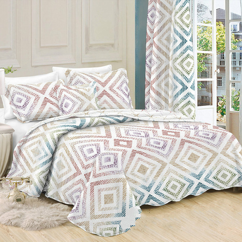 Υπέρδιπλο καλοκαιρινό κουβερλί με πολύχρωμο γεωμετρικό σχέδιο. Είναι κατασκευασμένο από μαλακό ύφασμα από 100% microfiber και γέμιση από πολυεστερική βάτα. Περιλαμβάνονται 2 καπιτονέ μαξιλαροθήκες τύπου oxford. Ιδανικό καλοκαιρινό σκέπασμα, που θα αναβαθμίσει την αισθητική του υπνοδωματίου. Συσκευασία βαλιτσάκι Polybag με φερμουάρ και χερούλι. **Το σχέδιο στις μαξιλαροθήκες ενδέχεται να διαφέρει από αυτό της φωτογραφίας, καθώς η εταιρεία παράγει μαξιλαροθήκες από όλο το σχέδιο του υφάσματος και τις συσκευάζει με τυχαία σειρά.**