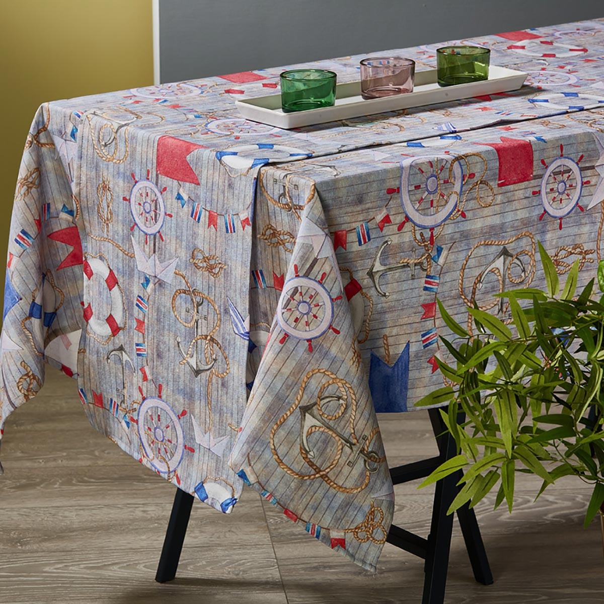 Τραπεζομάντηλο σε γκρι χρώμα, με καλοκαιρινό σχέδιο και κόκκινες λεπτομέρειες. Ύφασμα λονέτα από 50% βαμβάκι και 50% polyester. Ταιριάξτε το με τα υπόλοιπα είδη της ίδιας σειράς για ένα ολοκληρωμένο αποτέλεσμα.