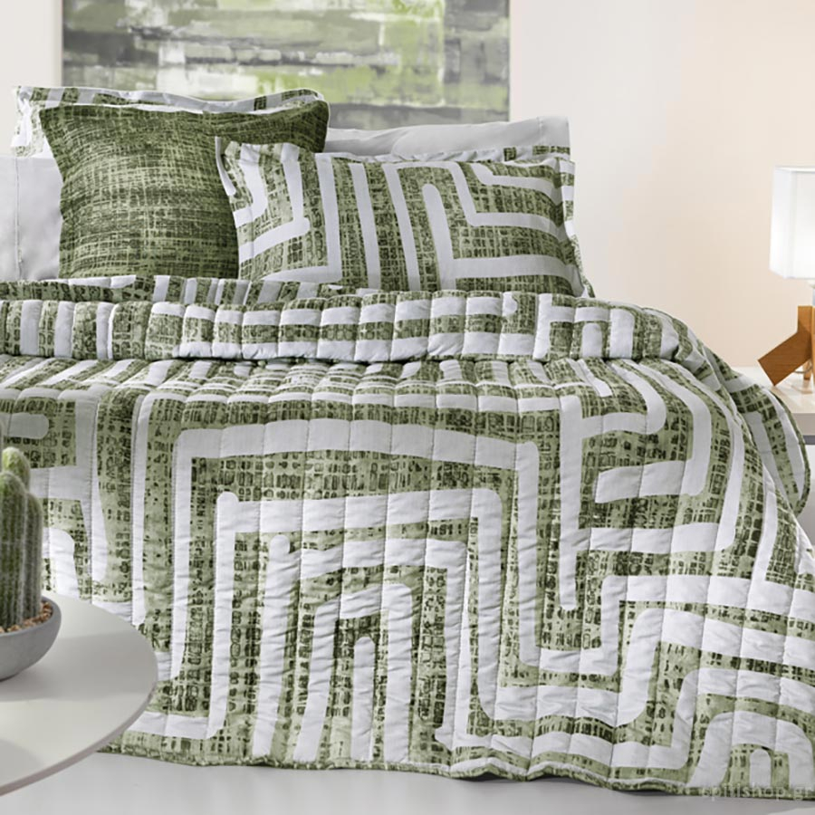 Υπέρδιπλο κουβερλί με μοντέρνο σχέδιο ψηφιακής εκτύπωσης, σε πράσινο χρώμα και γκρι λεπτομέρειες. Το εξωτερικό ύφασμα είναι από 100% microfiber, ενώ η γέμιση είναι λεπτή πολυεστερική βάτα, που το καθιστά ιδανικό ανοιξιάτικο και καλοκαιρινό σκέπασμα. Συνδυάστε το με τις μαξιλαροθήκες του ίδιου σχεδίου για ένα ολοκληρωμένο αποτέλεσμα.