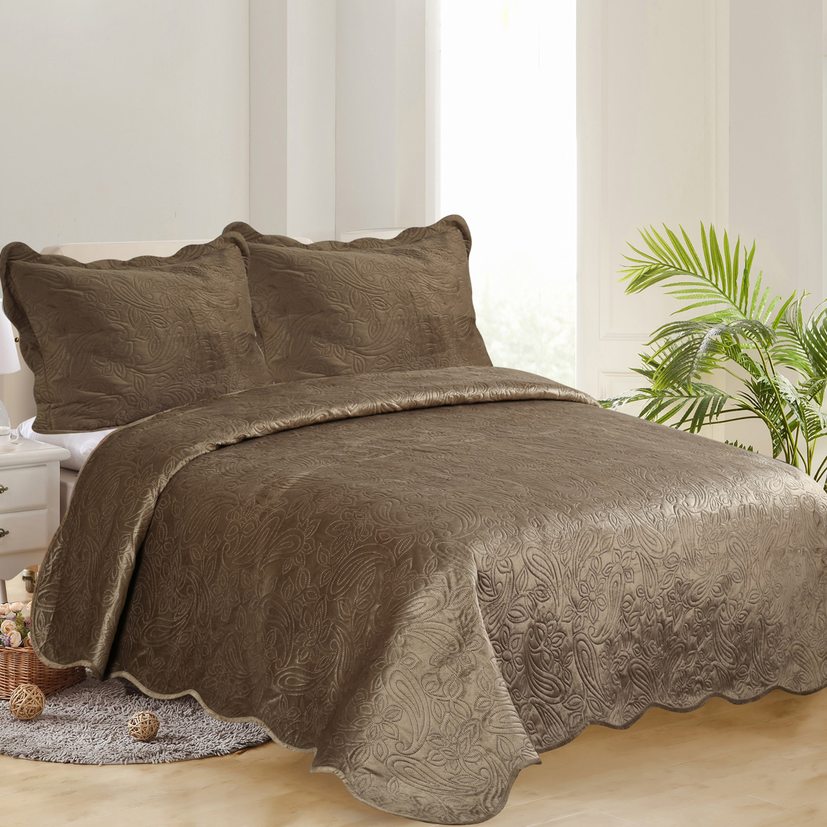 Βελουτέ κουβερλί υπέρδιπλο από την εταιρεία Silk Fashion. Σε καφέ χρώμα και ανάγλυφο σχέδιο λαχούρι. Το ύφασμα της πάνω μεριάς είναι βελουτέ από 100% Polyester με πολύ μαλακή υφή βάρους 180gsm, η γέμιση είναι από πολυεστερική βάτα βάρους 100gsm και η πίσω μεριά είναι από 100% microfiber βάρους 65gsm. Συνολικό βάρος 345gsm.