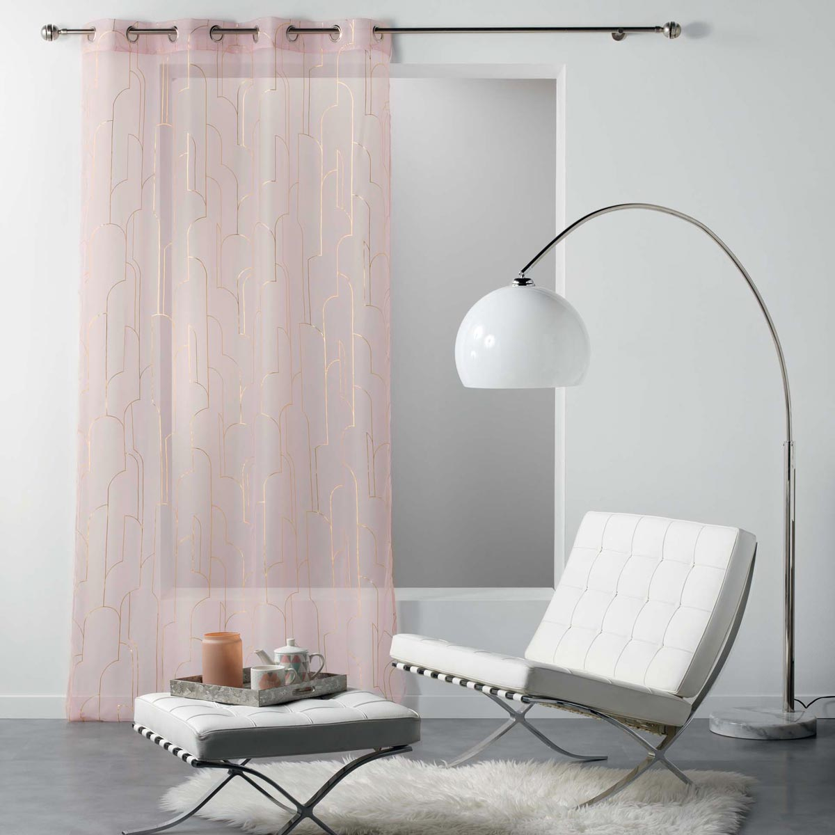 Κουρτίνα σε ροζ χρώμα με μοντέρνο σχέδιο. Οι λεπτομέρειες είναι μεταλλιζέ σε χρυσή απόχρωση. Το ύφασμα είναι βουάλ 100% polyester χαμηλής σκίασης, που επιτρέπει στο φως να περνάει. Στο επάνω μέρος έχει τρουκς κρεμάσματος με διάμετρο 4cm.