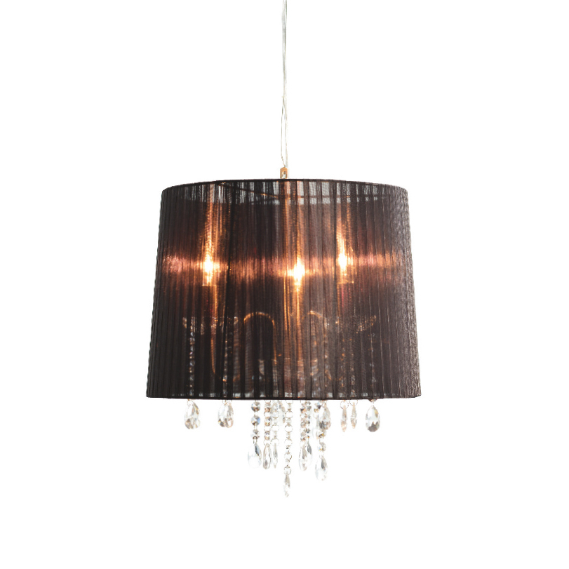 Φωτιστικό οροφής της εταιρείας Aca Decor σε vintage στυλ. Ο σκελετός του φωτιστικού, η ανάρτηση και η βάση τοποθέτησης είναι μεταλλικά σε ασημί απόχρωση. Διαθέτει υφασμάτινο ημιδιάφανο καπέλο σε μαύρο χρώμα. Φέρει διακοσμητικά διαφανή κρυσταλλάκια διαστάσεων: 1,5εκ.Χ1,5εκ. & 2,5εκ.Χ4εκ. Υπάρχει δυνατότητα αυξομείωσης του συνολικού ύψους έως 120εκ. μέσω του καλωδίου και της μεταλλικής ανάρτησης. Το καλώδιο είναι κατασκευασμένο από διάφανο PVC. Τύπος ντουί: 3xE14 και θέσεις για 3 λαμπτήρες έως 40W (δεν συμπεριλαμβάνονται).