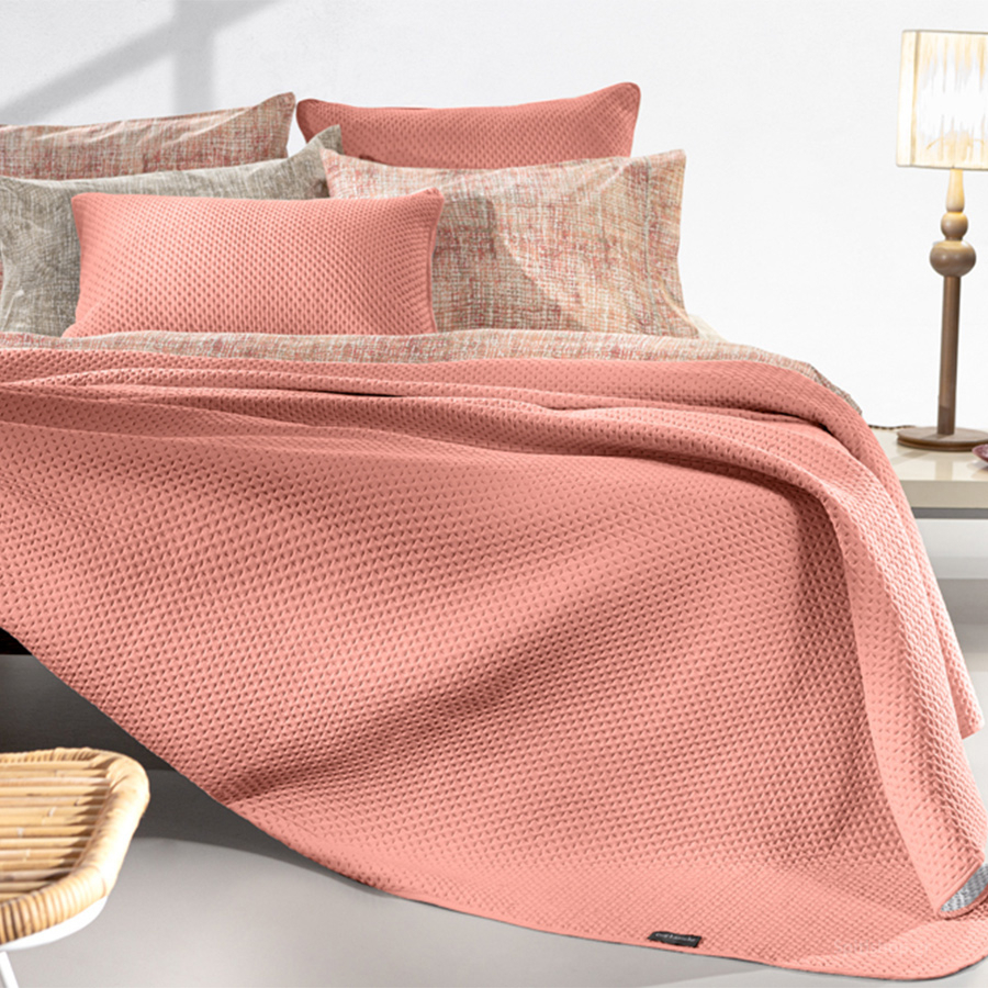 Μονό κουβερλί διπλής όψης με καπιτονέ ανάγλυφο σχέδιο από την εταιρεία Guy Laroche. Η μία του πλευρά είναι σε κοραλί χρώμα και η άλλη σε γκρι. Το εξωτερικό ύφασμα είναι κατασκευασμένο από 100% microfiber ενώ εσωτερικά διαθέτει λεπτή πολυεστερική βάτα, που το καθιστά ιδανικό ανοιξιάτικο και καλοκαιρινό σκέπασμα. Η συσκευασία του κουβερλί ειναι η διακοσμητική μαξιλαροθήκη.