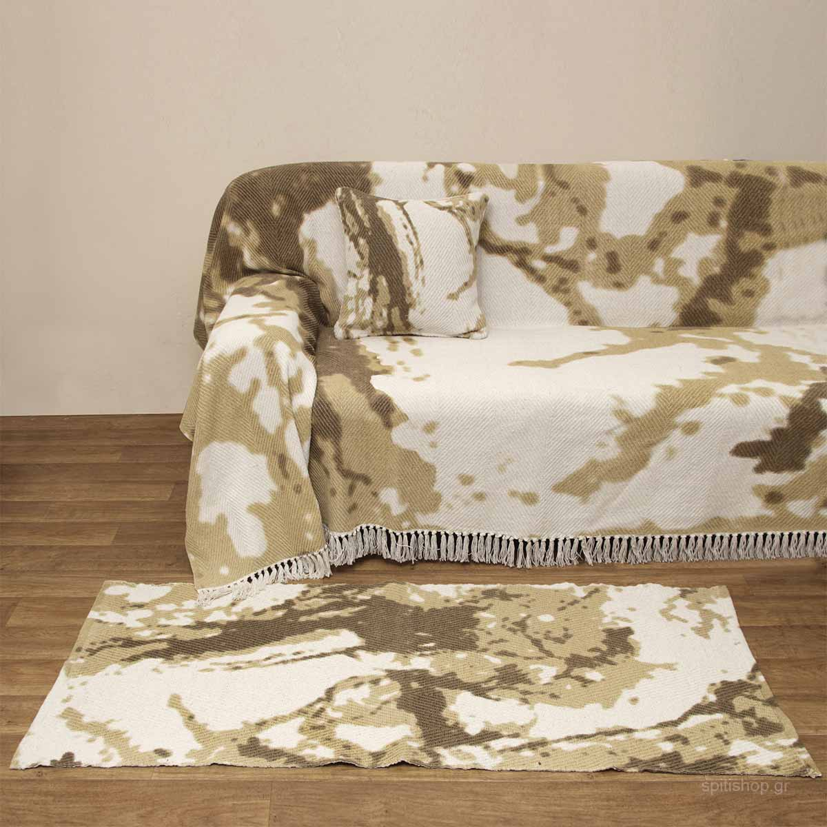 Χαλί της εταιρείας Viopros κατάλληλο για χρήση σε όλους τους χώρους. Έχει λευκό φόντο με τυπωτό μοντέρνο σχέδιο σε μουσταρδί-καφέ απόχρωση. Η συνθεσή του είναι βαμβακερή που καθιστά ιδανικό για χρήση όλο το χρόνο.
