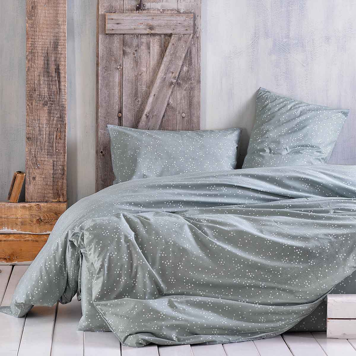 Υπέρδιπλο κουβερλί από την εταιρεία Rythmos. Έχει σχέδιο αστεριών σε γκρι φόντο με λευκές λεπτομέρειες. Η σύνθεσή του εξωτερικού υφάσματος είναι από 100% βαμβάκι 144 κλωστών που το καθιστά απαλό και ανθεκτικό. Η γέμιση είναι από πολυεστερική βάτα. Ιδανικό σκέπασμα για τους καλοκαιρινούς-ανοιξιάτικους μήνες. Στο σετ περιλαμβάνονται οι μαξιλαροθήκες φάκελος.