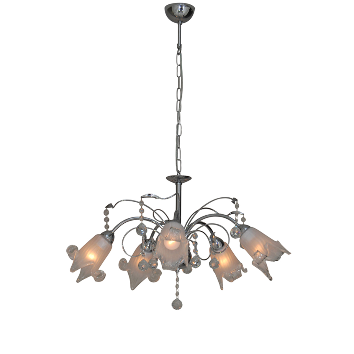 Φωτιστικό οροφής - πολυέλαιος της εταιρείας Homelighting σε vintage στυλ. Είναι κατασκευασμένο από μέταλλο σε απόχρωση χρωμίου. Φέρει 5 γυάλινα καπέλα σε λευκό ματ χρώμα. Διαθέτει μεταλλικές λεπτομέρειες με διάφανους διακοσμητικούς κρυστάλλους. Υπάρχει δυνατότητα αυξομείωσης του συνολικού ύψους έως 95εκ. μέσω του διάφανου καλωδίου ανάρτησης και της αλυσίδας. Η βάση τοποθέτησης είναι ασημί μεταλλική. Τύπος ντουί: 5xE14 και θέσεις για 5 λαμπτήρες έως 40W έκαστος (δεν συμπεριλαμβάνονται). Τάση: 230Volt.