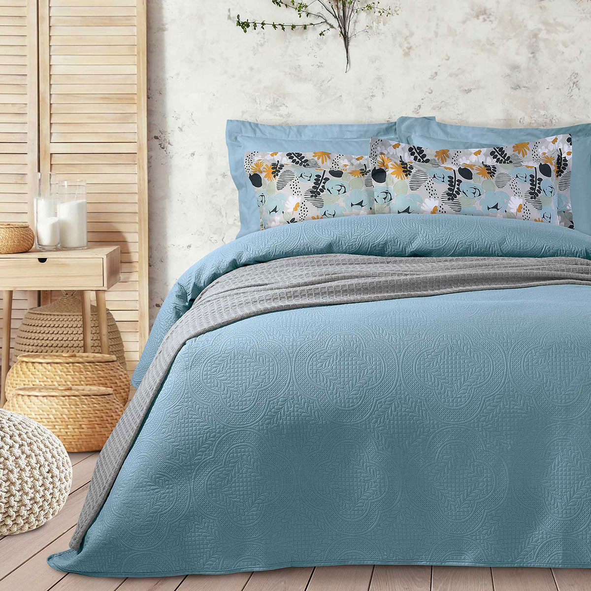Κουβερλί σε γαλάζιο χρώμα και ανάγλυφο σχέδιο από την εταιρία Das. Έχει εξωτερικό υποαλλεργικό ύφασμα από 100% microfiber που προσφέρει ανθεκτικότητα και απαλή αφή, ενώ η γέμιση είναι από πολυεστερική βάτα. Ιδανικό καλοκαιρινό σκέπασμα.