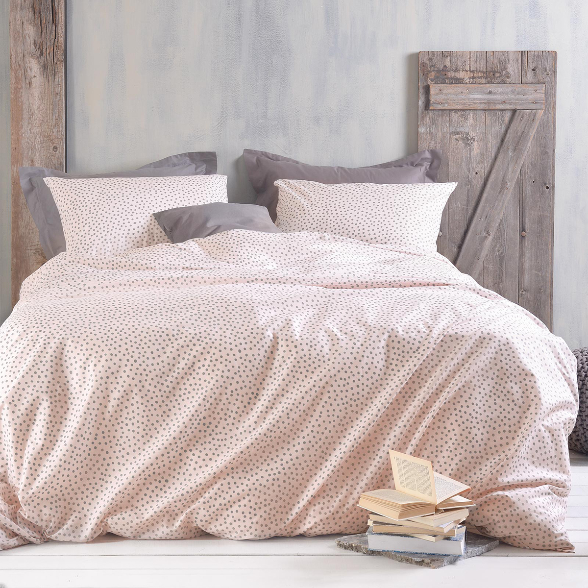 Υπέρδιπλο κουβερλί της εταιρείας Rythmos σε σομόν χρώμα με γκρι λεπτομέρειες και πουά σχέδιο. Η σύνθεσή του εξωτερικού υφάσματος είναι από 50% βαμβάκι-50% polyester 144 κλωστών που το καθιστά απαλό και ανθεκτικό ενώ η γέμιση είναι από πολυεστερική βάτα. Ιδανικό σκέπασμα για τους καλοκαιρινούς-ανοιξιάτικους μήνες. Στο σετ περιλαμβάνονται οι μαξιλαροθήκες φάκελος με το σχέδιο του πανωσέντονου.