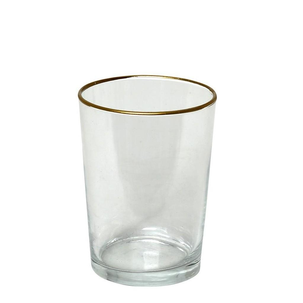Ποτήρι νερού χωρητικότητας 510ml σε διάφανο χρώμα και χρυσή λεπτομέρεια περιμετρικά από την εταιρεία Espiel. Είναι κατασκευασμένο από γυαλί και μπορεί να τοποθετηθεί στον φούρνο μικροκυμάτων και στο πλυντήριο πιάτων (έως και 300 πλύσεις). Μπορείτε επίσης να το χρησιμοποιήσετε και για διάφορα ποτά. Συνδυάστε το με τα υπόλοιπα είδη της ίδιας σειράς για ένα ολοκληρωμένο σετ.