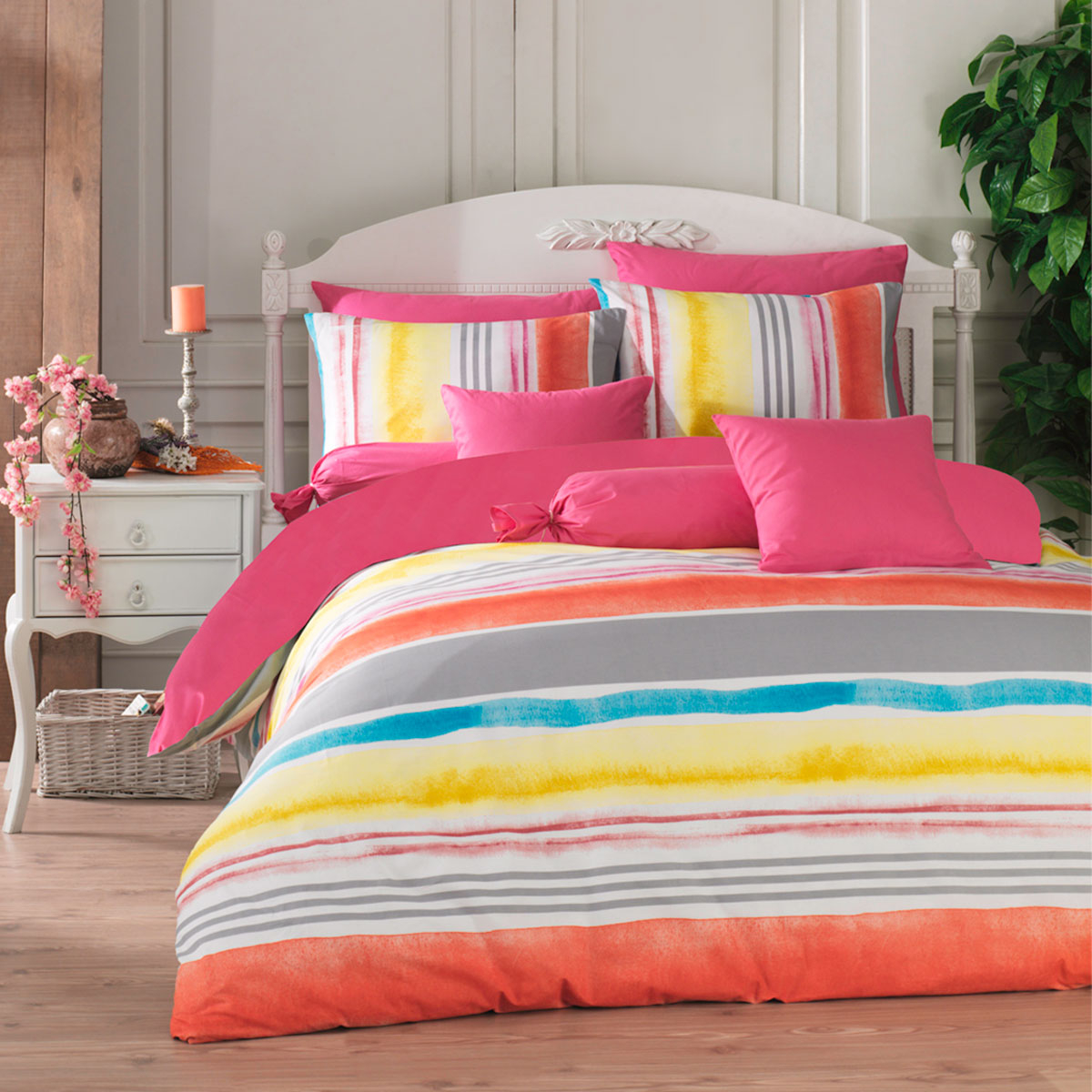 Υπέρδιπλο κουβερλί σε πολύχρωμες αποχρώσεις και μοντέρνο σχέδιο από την εταιρία Viopros. Το εξωτερικό ύφασμα είναι από 100% βαμβάκι περκάλι 170 κλωστών που προσφέρει απαλή αίσθηση και ανθεκτικότητα. Εσωτερικά έχει γέμιση από λεπτή πολυεστερική βάτα που το καθιστά ιδανικό σκέπασμα για τους ανοιξιάτικους και καλοκαιρινούς μήνες. Από την μία πλευρά έχει το σχέδιο του πανωσέντονου και από την άλλη το σχέδιο του κατωσέντονου. Στο σετ περιλαμβάνονται οι μαξιλαροθήκες φάκελος με το σχέδιο του πανωσέντονου. **Το σχέδιο στις μαξιλαροθήκες ενδέχεται να διαφέρει από αυτό της φωτογραφίας, καθώς η εταιρεία παράγει μαξιλαροθήκες από όλο το σχέδιο του υφάσματος και τις συσκευάζει με τυχαία σειρά.**