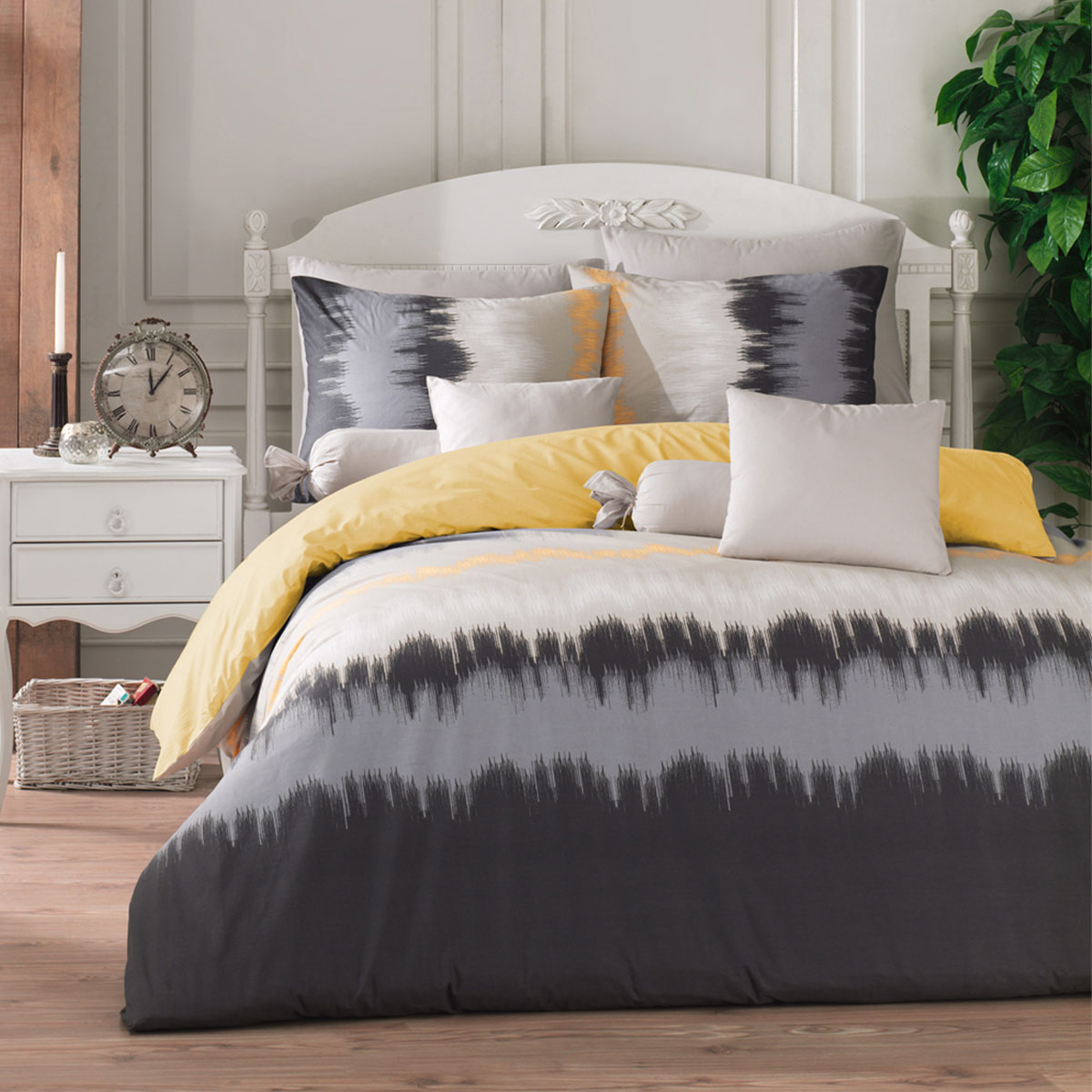Υπέρδιπλο κουβερλί με μοντέρνο σχέδιο σε γκρι αποχρώσεις και κίτρινες λεπτομέρειες από την εταιρία Viopros. Το εξωτερικό ύφασμα είναι από 100% βαμβάκι περκάλι 170 κλωστών που προσφέρει απαλή αίσθηση και ανθεκτικότητα. Εσωτερικά έχει γέμιση από λεπτή πολυεστερική βάτα που το καθιστά ιδανικό σκέπασμα για τους ανοιξιάτικους και καλοκαιρινούς μήνες. Από την μία πλευρά έχει το σχέδιο του πανωσέντονου και από την άλλη το σχέδιο του κατωσέντονου. Στο σετ περιλαμβάνονται οι μαξιλαροθήκες φάκελος με το σχέδιο του πανωσέντονου. **Το σχέδιο στις μαξιλαροθήκες ενδέχεται να διαφέρει από αυτό της φωτογραφίας, καθώς η εταιρεία παράγει μαξιλαροθήκες από όλο το σχέδιο του υφάσματος και τις συσκευάζει με τυχαία σειρά.**