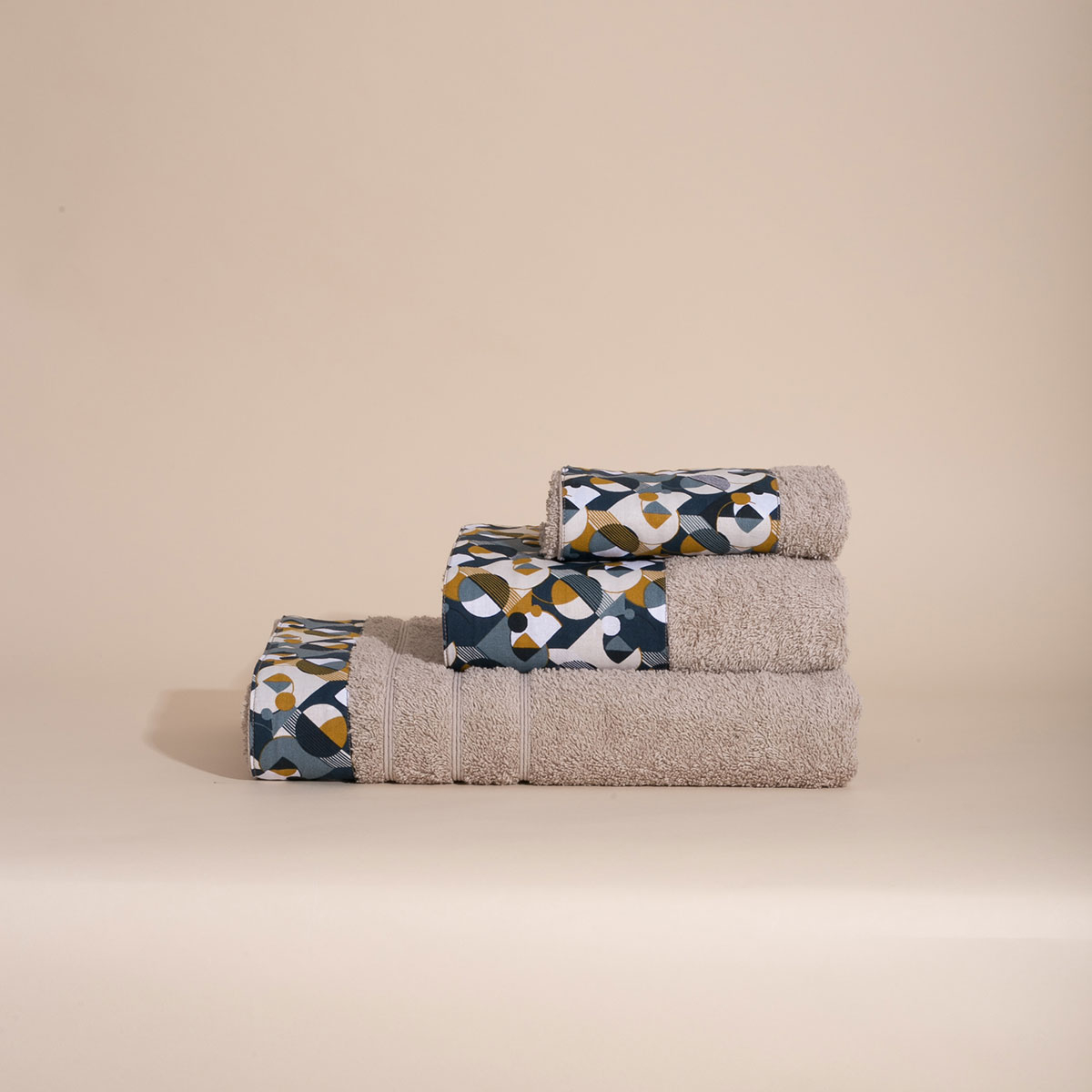 Πετσέτα χεριών από την εταιρεία White Fabric. Έχει μπεζ χρώμα και υφασμάτινη φάσα με μοντέρνο σχέδιο σε πετρόλ-γκρι-μουσταρδί αποχρώσεις. Κατασκευασμένη από 100% εξαιρετικό βαμβακερό ύφασμα, βάρους 550gsm, που την κάνει απαλή και απορροφητική.