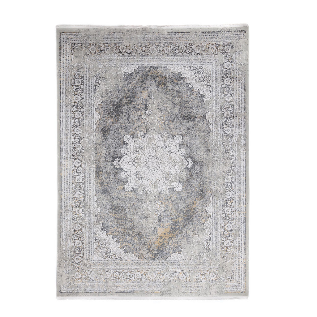 Χαλί μηχανής 160x230 από τη σειρά Bamboo Silk της εταιρείας Royal Carpet σε γκρι αποχρώσεις. Απαλό αλλά ανθεκτικό χαλί με καλοδουλεμένη μίξη χρωμάτων και εντυπωσιακό vintage σχέδιο. Ξεχωρίζει για την υψηλή πυκνότητα, την αντοχή στο χρόνο και τη σωστή εφαρμογή του, που το καθιστούν εφάμιλλο των χειροποίητων χαλιών. Μπορεί να τοποθετηθεί σε όλους τους χώρους του σπιτιού αναβαθμίζοντας την αισθητική τους. Είναι κατασκευασμένο από εξαιρετικής ποιότητας ανεξίτηλα νήματα από τεχνητό μετάξι bamboo και ακρυλικό. Tο βάρος του χαλιού είναι 3.200gsm και το ύψος του πέλους του είναι 7mm. Η υψηλή περιεκτικότητα σε τεχνητό μεταξωτό νήμα σε συνδυασμό με τη μεγάλη πυκνότητα των 2.000.000κόμπων/τ.μ. δημιουργούν ένα πυκνό και εντυπωσιακό χαλί. Έχει εξαιρετικής ποιότητας κρόσσι και υφαντό υπόστρωμα. Είναι αντιστατικό επομένως δεν μαγνητίζονται χνούδια, μικροσωματίδια και σκόνη στην επιφάνεια του χαλιού. Δεν εμπεριέχει επικίνδυνες για τον ανθρώπινο οργανισμό αλλεργιογόνες ή χημικές βλαβερές ουσίες. Τα χαλιά Royal Carpet είναι οικολογικά και φιλικά προς την υγεία.