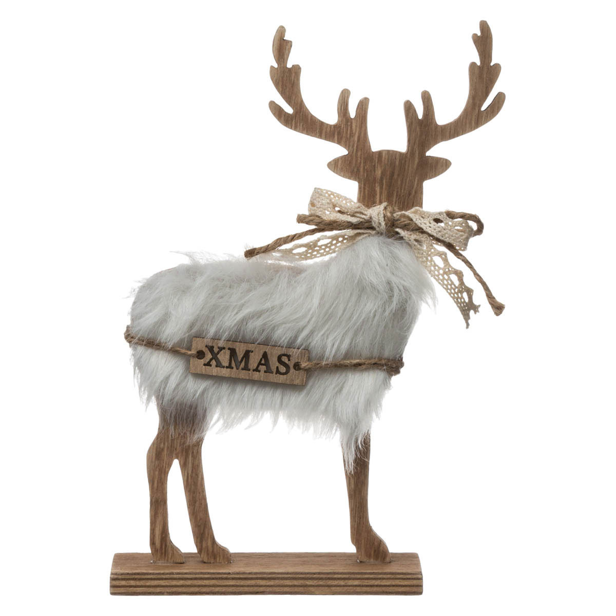 Χριστουγεννιάτικο διακοσμητικό κατασκευασμένο από ξύλο με σχήμα ταράνδου. Σε φυσική απόχρωση ξύλου με λεπτομέρειες από λευκή γούνα και δαντέλα. Συνδυάστε το με χριστουγεννιάτικα διακοσμητικά, τραπεζομάντηλα, τραβέρσες κ.α. για να ολοκληρώσετε την χριστουγεννιάτικη διακόσμηση του σπιτιού σας.