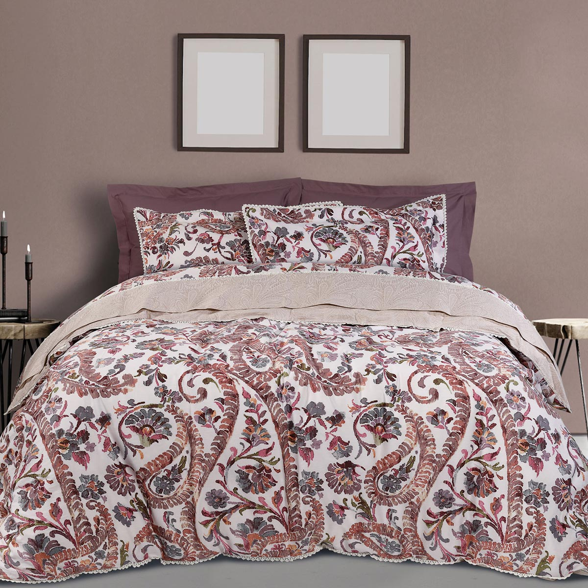 Παπλωματοθήκη υπέρδιπλη σετ σε σάπιο μήλο χρώμα, εκρού-λιλά λεπτομέρειες και έθνικ σχέδιο από την εταιρία Das Home. Είναι κατασκευασμένη από 100% υποαλλεργικό βαμβακοσατέν 210 κλωστών που προσφέρει απαλότητα και ανθεκτικότητα. Κλείνει με φερμουάρ.**Στο σετ περιλαμβάνονται οι μαξιλαροθήκες oxford με το σχέδιο του πανωσέντονου.** **Το σχέδιο στις μαξιλαροθήκες ενδέχεται να διαφέρει από αυτό της φωτογραφίας καθώς η εταιρία παράγει μαξιλαροθήκες από όλο το σχέδιο του υφάσματος και τις συσκευάζει με τυχαία σειρά.**