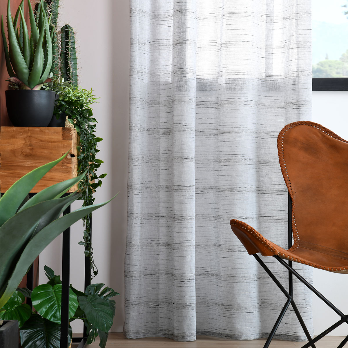 Κουρτίνα εσωτερικού χώρου σε λευκό χρώμα με γκρι λεπτομέρειες. Είναι κατασκευασμένη από 100% polyester με ενσωματωμένα τρουκς για εύκολη τοποθέτηση. Το ύφασμα είναι χαμηλής σκίασης που επιτρέπει να περάσει στον χώρο πολύ φως.