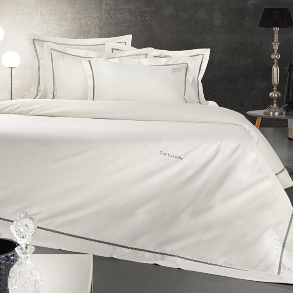 Παπλωματοθήκη υπέρδιπλη σετ σε εκρού χρώμα με γκρι αζούρ στην φάσα από την εταιρία Guy Laroche. Το ύφασμα είναι 100% βαμβακοσατέν 200 κλωστών που ξεχωρίζει για την απαλότητα και την ανθεκτικότητά του. Στο σετ περιλαμβάνονται και οι μαξιλαροθήκες oxford με γκρι αζούρ περιμετρικό σχέδιο.
