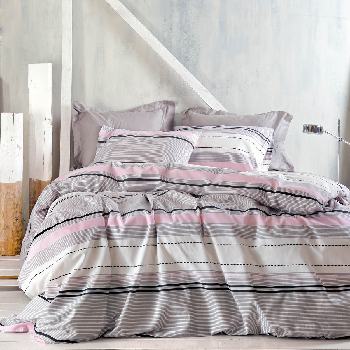 Κουβερλί μονό σετ από την εταιρεία Rythmos. Έχει ροζ-γκρι-εκρού χρώμα και ριγέ σχέδιο με μαύρες λεπτομέρειες. Η εξωτερική του σύνθεση αποτελείται από 50% βαμβάκι-50% polyester 144 κλωστών και η γέμιση από πολυεστερική βάτα. Στο σετ περιλαμβάνεται η μαξιλαροθήκη φάκελος με το σχέδιο του πανωσέντονου. ** Το σχέδιο στις μαξιλαροθήκες ενδέχεται να διαφέρει από αυτό της φωτογραφίας, καθώς η εταιρεία παράγει μαξιλαροθήκες από όλο το σχέδιο του υφάσματος και τις συσκευάζει με τυχαία σειρά.**