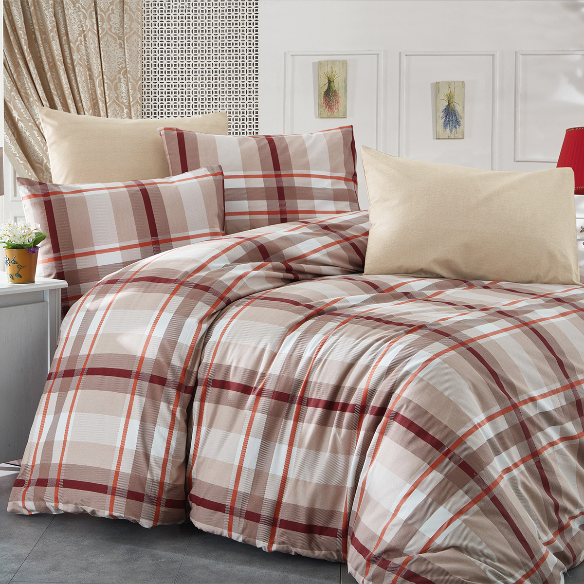 Παπλωματοθήκη υπέρδιπλη σε μπεζ χρώμα, μπορντώ-λευκές λεπτομέρειες και καρό σχέδιο από την εταιρία Dimcol. Το ύφασμα είναι από 70% βαμβάκι-30% polyester 144 κλωστών. Είναι απαλή στην αφή, ανθεκτική στη χρήση και προστατεύει το πάπλωμα. Διαθέτει στο κάτω μέρος φερμουάρ. Συνδυάστε την με τα υπόλοιπα είδη της ίδιας σειράς για ένα ολοκληρωμένο σετ. Συσκευασία polybag.
