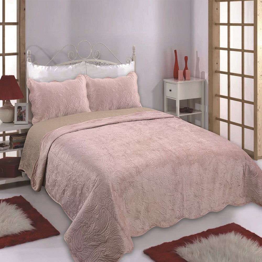 Υπέρδιπλο κουβερλί σε ροζ χρώμα και ανάγλυφα λαχούρια από την εταιρία Silk Fashion. Η επάνω πλευρά είναι supersoft τύπου βελουτέ 180gsm, η κάτω πλευρά είναι υφασμάτινη σύνθεσης 50% βαμβάκι-50% polyester 65gsm και η γέμιση είναι λεπτή πολυεστερική βάτα 100gsm. Συνολικό βάρος 345gsm. Ιδανικό σκέπασμα για την άνοιξη και το φθινόπωρο ενώ μπορεί να χρησιμοποιηθεί και σαν διακοσμητικό στοιχείο στο κρεβάτι σας.