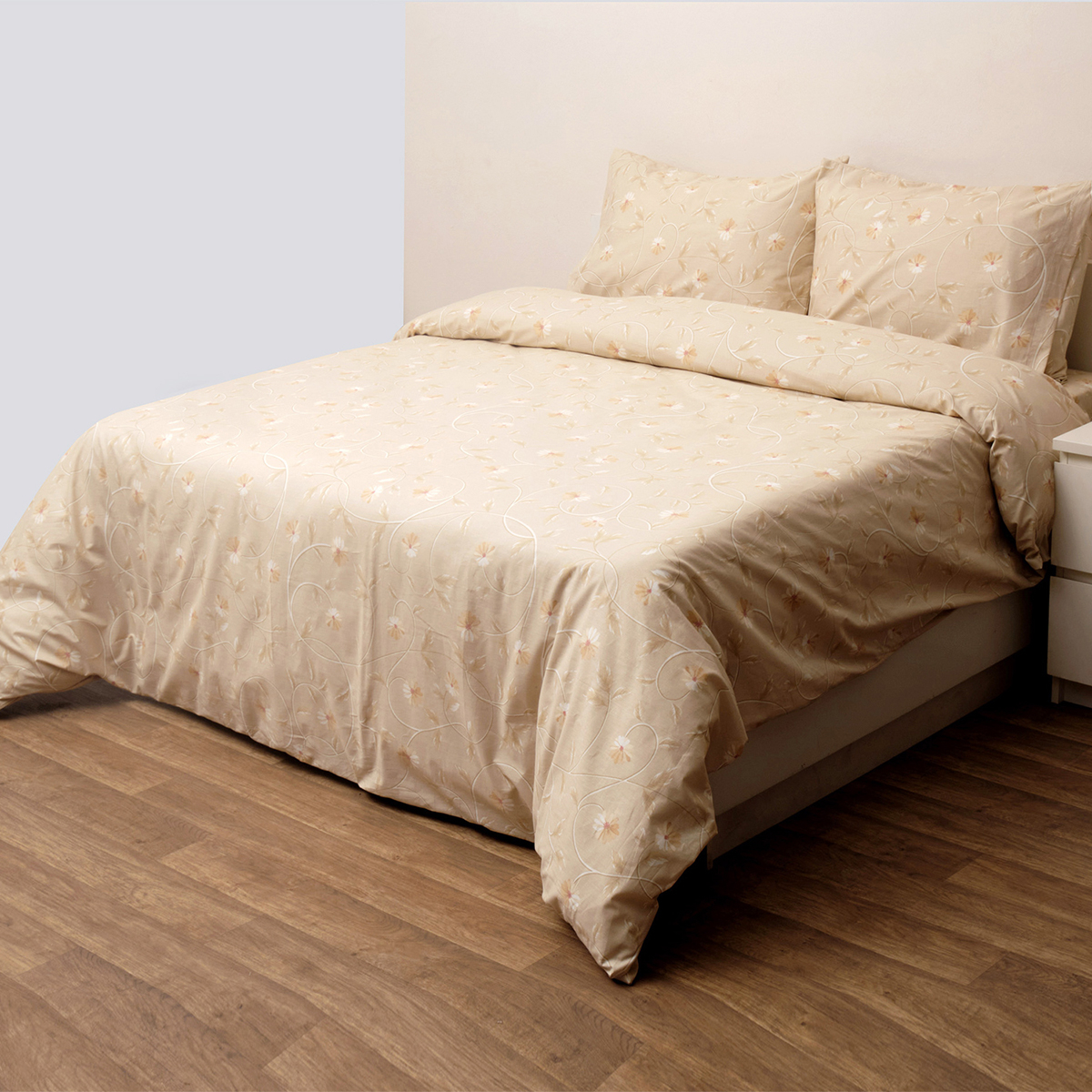 Κουβερλί μονό σετ σε μπεζ χρώμα, εκρού-μπεζ λεπτομέρειες και φλοράλ σχέδιο από την εταιρία Viopros. Το εξωτερικό του ύφασμα είναι κατασκευασμένο από 100% βαμβάκι 145 κλωστών που το καθιστά εξαιρετικά μαλακό και ανθεκτικό και η γέμιση από πολυεστερική βάτα. Στο σετ περιλαμβάνεται η μαξιλαροθήκη φάκελος με το σχέδιο του πανωσέντονου.
