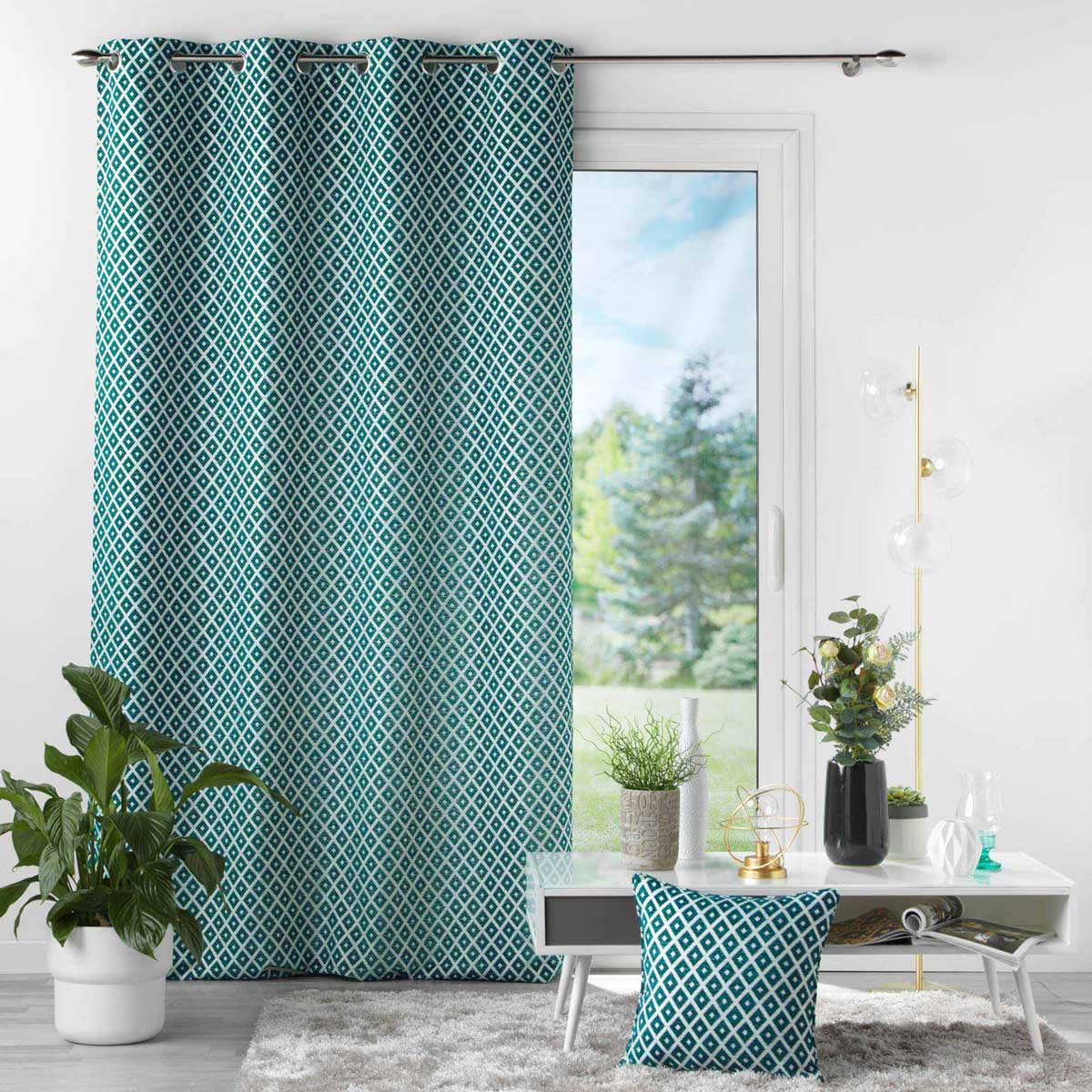 Κουρτίνα σε πετρόλ χρώμα και γεωμετρικό σχέδιο. Το ύφασμα είναι ζακάρ 100% πολυεστερικό με υψηλή σκίαση. Στο επάνω μέρος διαθέτει τρουκς κρεμάσματος με διάμετρο 4cm για εύκολη τοποθέτηση. Συνδυάστε το χρώμα και το ύφος της κουρτίνας με τον χώρο σας και ανανεώστε την διακόσμησή του.