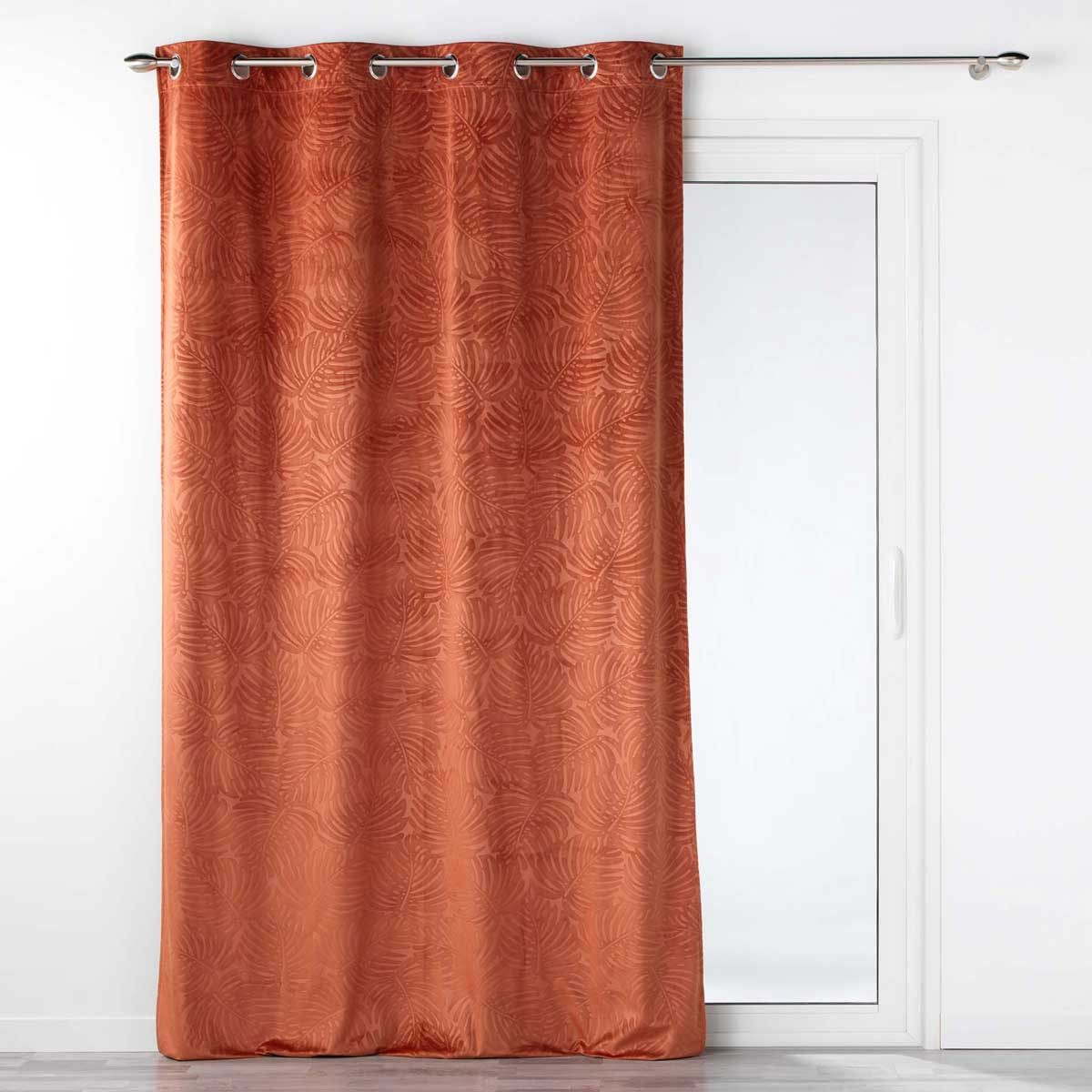 Βελουτέ κουρτίνα συσκότισης σε απόχρωση τερακότας με ανάγλυφο tropical σχέδιο. Το ύφασμα είναι βελουτέ πλήρους αδιαφάνειας από 100% polyester. Στο επάνω μέρος διαθέτει τρουκς κρεμάσματος με διάμετρο 4cm για εύκολη τοποθέτηση. Συνδυάστε το χρώμα και το ύφος της κουρτίνας με τον χώρο σας και ανανεώστε την διακόσμησή του.
