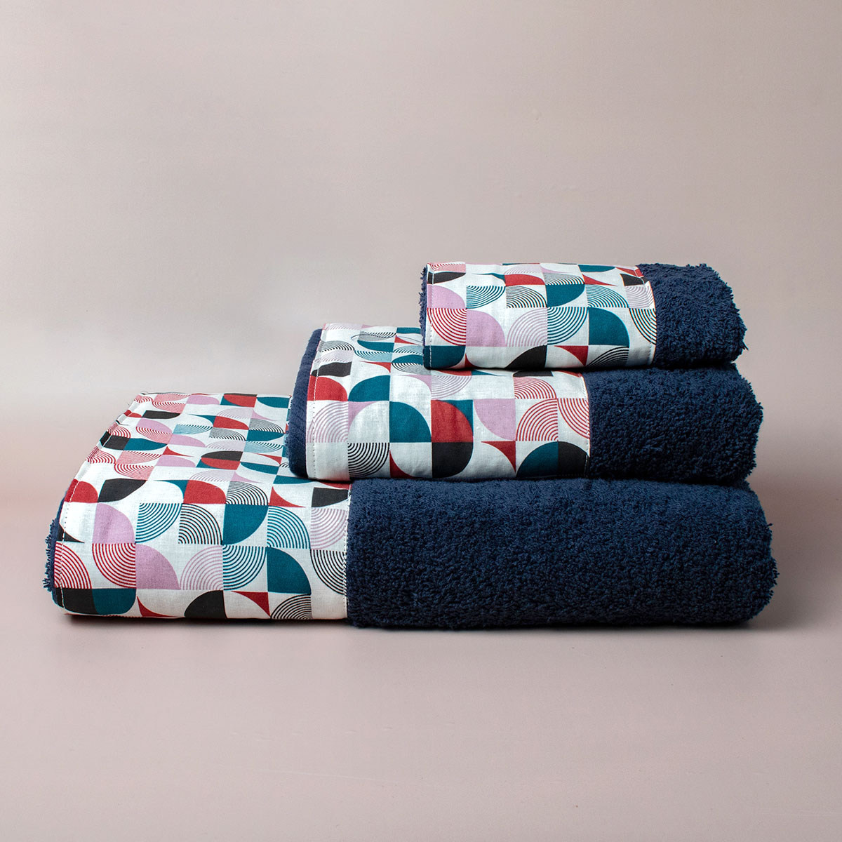 Σετ πετσέτες μπάνιου από την εταιρεία White Fabric. Έχουν μπλε χρώμα και πολύχρωμη φάσα με γεωμετρικό σχέδιο. Κατασκευασμένες από 100% εξαιρετικό βαμβακερό ύφασμα, βάρους 600gsm, που τις καθιστά απαλές και απορροφητικές.