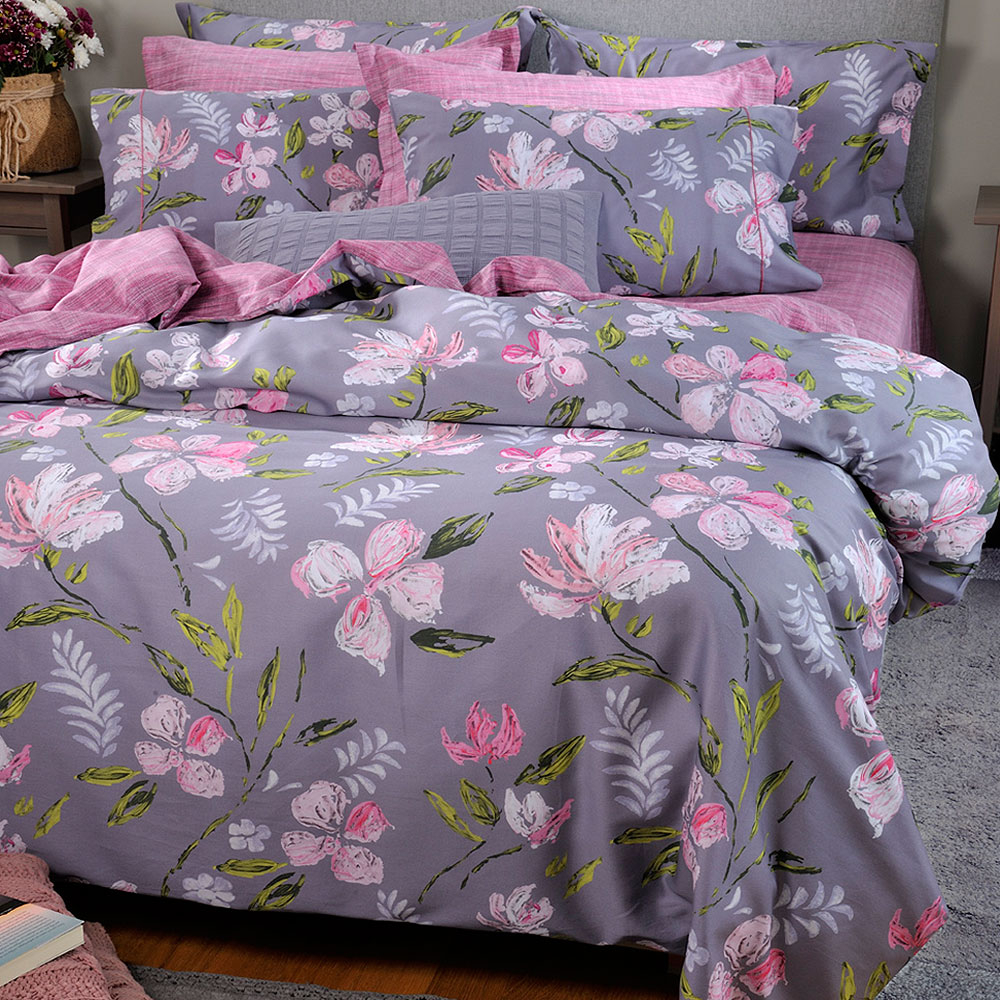 Γίγας παπλωματοθήκη από την εταιρεία Down Town με φλοράλ σχέδιο σε γκρι-ροζ χρώμα και λευκές-πράσινες λεπτομέρειες. Η ποιότητά της από 100% βαμβακοσατέν νήματα πενιέ 220 κλωστών προσφέρει απαλή αίσθηση και ευκολία στο σιδέρωμα. Aπό την μια μεριά έχει το σχέδιο του πανωσέντονου και από την άλλη το σχέδιο του κατωσέντονου. Στο σετ περιλαμβάνονται οι μαξιλαροθήκες φάκελος με το σχέδιο του πανωσέντονου.