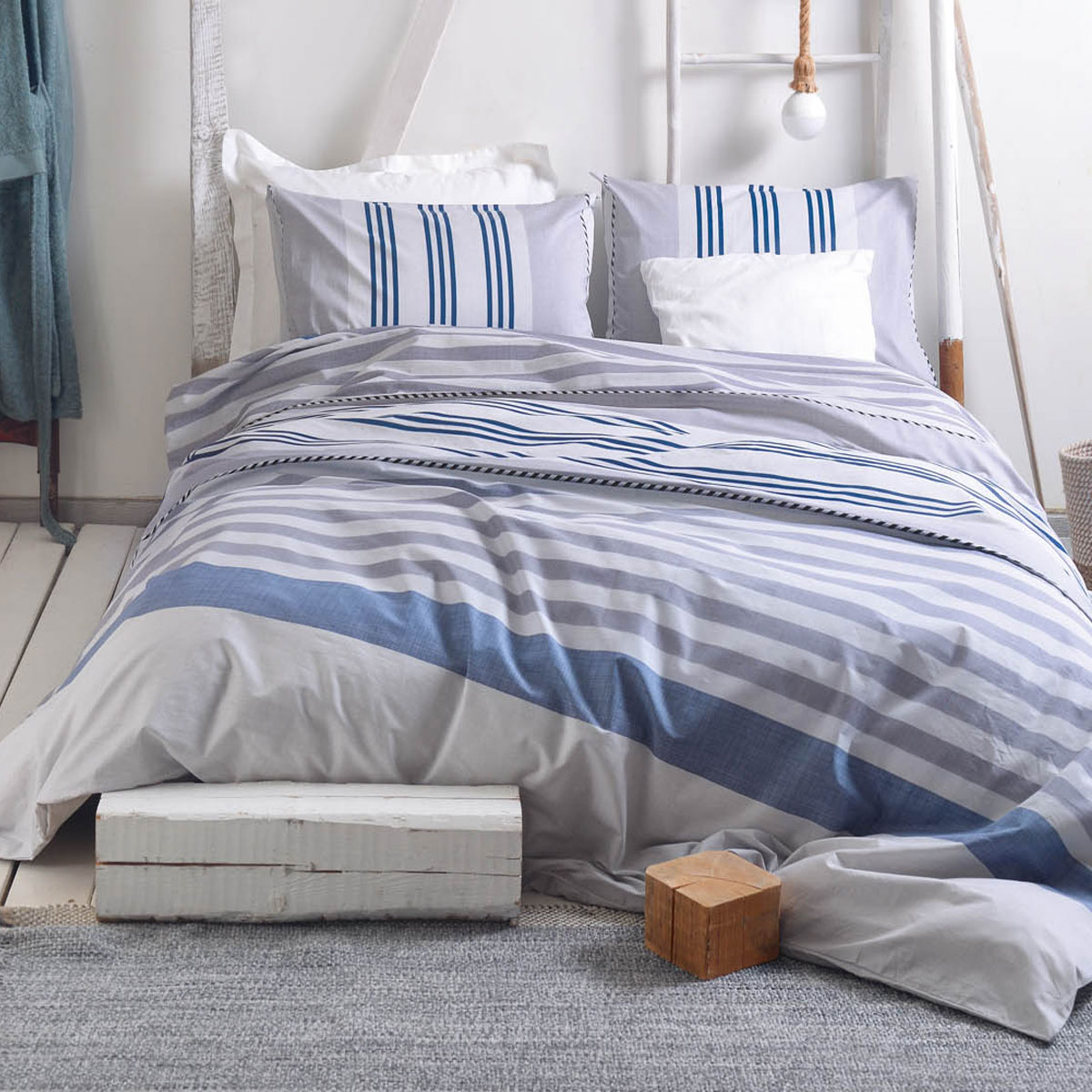 Κουβερλί υπέρδιπλο σε μπλε-γκρι χρώμα και ριγέ σχέδιο από την εταιρεία Rythmos. Η ποιότητά του από 100% βαμβάκι 144 κλωστών προσφέρει ανθεκτικότητα και απαλότητα. Η γέμιση είναι από πολυεστερική βάτα. Στο σετ περιλαμβάνονται οι μαξιλαροθήκες φάκελος με το σχέδιο του πανωσέντονου. Ιδανικό σκέπασμα για τους ανοιξιάτικους και καλοκαιρινούς μήνες. Συνδυάστε το με τα υπόλοιπα είδη της ίδιας σειράς για ένα ολοκληρωμένο αποτέλεσμα.