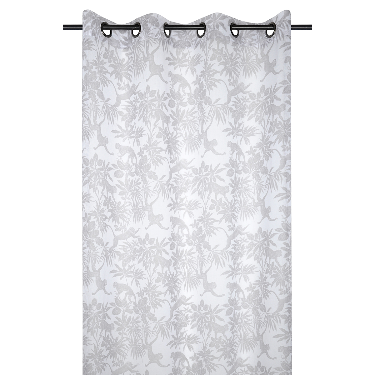 Κουρτίνα εσωτερικού χώρου, με γκρι φόντο, λευκές λεπτομέρειες και tropical σχέδιο. Κατασκευασμένη από 100% polyester και ενσωματωμένα τρουκς για εύκολη τοποθέτηση. Το ύφασμα είναι χαμηλής σκίασης. Διακοσμήστε την σε όποιο χώρο του σπιτιού σας επιθυμείτε και δημιουργήστε ένα ξεχωριστό στυλ.
