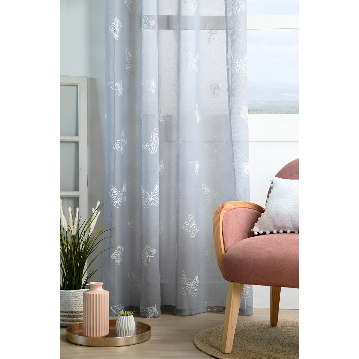 Κουρτίνα εσωτερικού χώρου, σε γκρι χρώμα και λευκές κεντητές λεπτομέρειες με σχέδιο πεταλούδα. Κατασκευασμένη από 100% polyester και ενσωματωμένα τρουκς για εύκολη τοποθέτηση. Το ύφασμα είναι χαμηλής σκίασης. Διακοσμήστε την σε όποιο χώρο του σπιτιού σας επιθυμείτε και δημιουργήστε ένα ξεχωριστό στυλ.