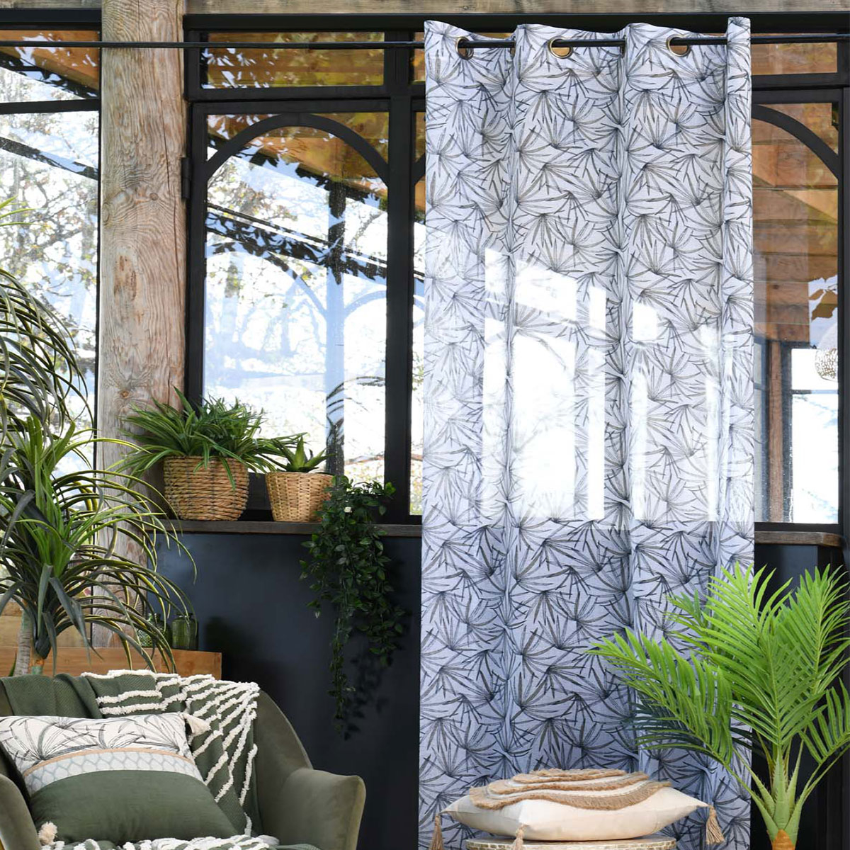 Κουρτίνα εσωτερικού χώρου, σε λευκό φόντο, ανθρακί λεπτομέρειες και μοντέρνο σχέδιο. Κατασκευασμένη από 100% polyester και ενσωματωμένα τρουκς για εύκολη τοποθέτηση. Το ύφασμα είναι χαμηλής σκίασης. Διακοσμήστε την σε όποιο χώρο του σπιτιού σας επιθυμείτε και δημιουργήστε ένα ξεχωριστό στυλ.