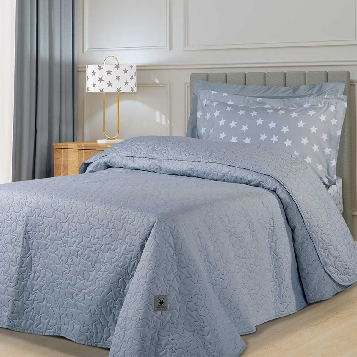 Υπέρδιπλο κουβερλί σε γκρι χρώμα και ανάγλυφο σχέδιο αστέρια από τον οίκο Greenwich Polo Club. Το εξωτερικό ύφασμα είναι από 100% microfiber και εσωτερικά έχει λεπτή πολυεστερική βάτα. Ιδανικό ανοιξιάτικο και καλοκαιρινό σκέπασμα.