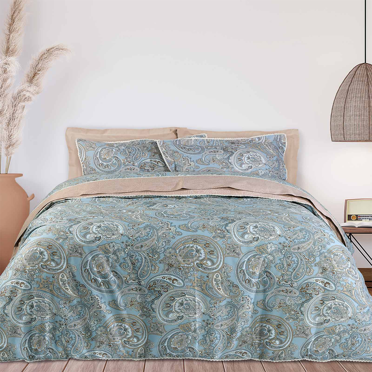 Κουβερλί υπέρδιπλο σε γαλάζιο χρώμα, με μπεζ-καφέ λεπτομέρειες και έθνικ σχέδιο από την εταιρεία Das Home. Το εξωτερικό ύφασμα είναι 100% βαμβακοσατέν 210 κλωστών που το καθιστά απαλό και ανθεκτικό ενώ η γέμιση είναι από πολυεστερική βάτα. Ιδανικό σκέπασμα για τους ανοιξιάτικους και καλοκαιρινούς μήνες. Συνδυάστε το, με τα υπόλοιπα είδη της ίδιας σειράς για ένα ολοκληρωμένο αποτέλεσμα.