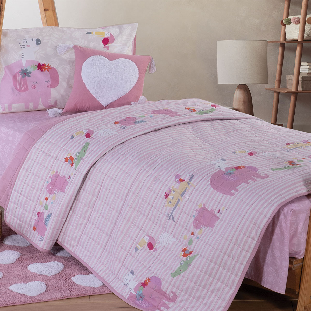 Παιδικό κουβερλί διπλής όψης σε ροζ-λιλά χρώμα με πολύχρωμες λεπτομέρειες και σχέδιο ζωάκια από την εταιρεία Nef-Nef. Το εξωτερικό ύφασμα είναι από 100% microfiber βάρους 75gr/m2 ενώ η γέμιση είναι από πολυεστερική βάτα βάρους 200gr/m2. Ιδανική επιλογή για τους ανοιξιάτικους και καλοκαιρινούς μήνες. Συνδυάστε το με τα υπόλοιπα προϊόντα της ίδιας σειράς για ένα ολοκληρωμένο αποτέλεσμα.