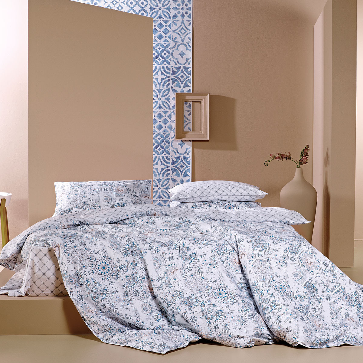 Υπέρδιπλο κουβερλί από την εταιρεία Kentia. Έχει μοντέρνο σχέδιο σε λευκό χρώμα με μπλε-γκρι λεπτομέρειες. Το εξωτερικό ύφασμα είναι 100% βαμβάκι περκάλι 200 κλωστών, εξαιρετικής ποιότητας και φίνου νήματος, που προσφέρει πολύ απαλή υφή και ανθεκτικότητα. Εσωτερικά έχει λεπτή πολυεστερική βάτα, που το καθιστά ιδανικό σκέπασμα για τους ανοιξιάτικους και καλοκαιρινούς μήνες. Είναι διπλής όψης, η μία μεριά έχει το σχέδιο του πανωσέντονου και η άλλη το σχέδιο του κατωσέντονου.
