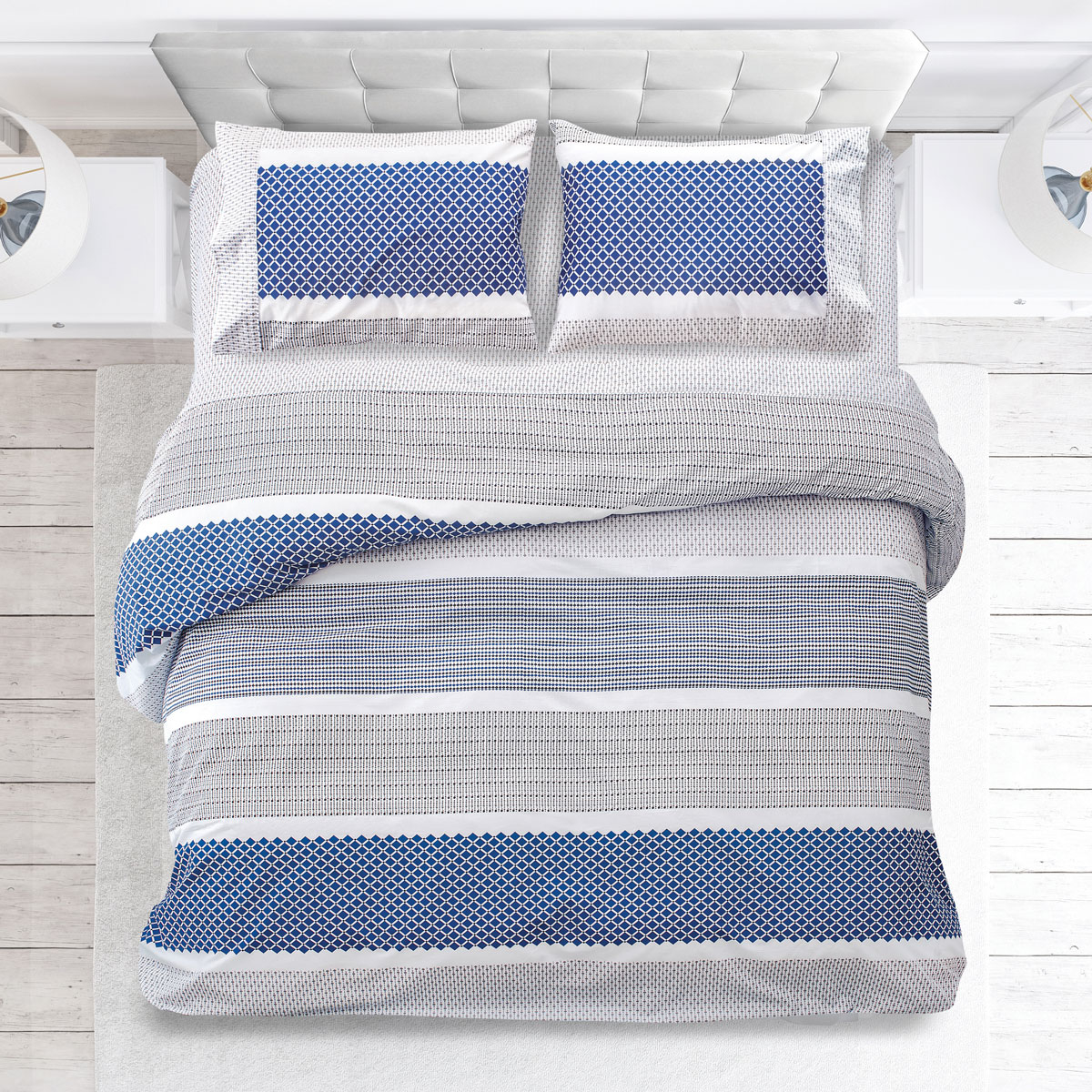 Κουβερλί υπέρδιπλο από την εταιρεία Makis Tselios σε λευκό χρώμα με μπλε-γκρι και μαύρες λεπτομέρειες. Έχει μοντέρνο σχέδιο. Το εξωτερικό του ύφασμα είναι από 100% βαμβάκι 144 κλωστών που προσφέρει ανθεκτικότητα και απαλότητα. Η γέμιση του είναι από 100% πολυεστερική βάτα. Στο σετ περιλαμβάνονται οι μαξιλαροθήκες φάκελος με το σχέδιο του πανωσέντονου. Ιδανικό ανοιξιάτικο-καλοκαιρινό σκέπασμα. Συνδυάστε το με τα υπόλοιπα είδη της ίδιας σειράς για ένα ολοκληρωμένο αποτέλεσμα.