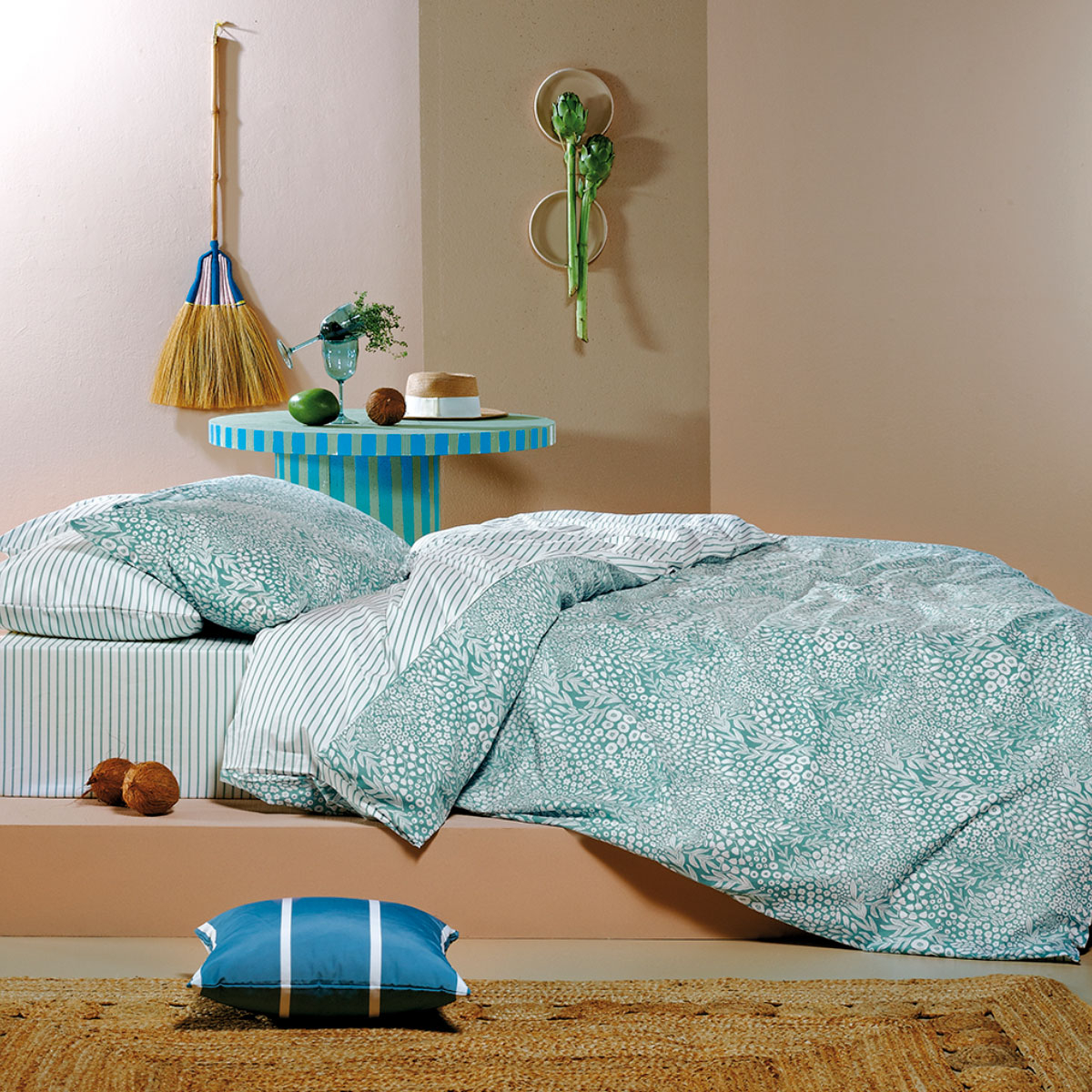 Υπέρδιπλο κουβερλί από την εταιρεία Kentia. Έχει φλοράλ σχέδιο σε βεραμάν απόχρωση με λευκές λεπτομέρειες. Το εξωτερικό ύφασμα είναι 100% microfiber βάρους 100γραμ./τ.μ. Εσωτερικά έχει λεπτή γέμιση από 3D hollowfiber βάρους 120γραμ./τ.μ. , που το καθιστά ιδανικό σκέπασμα για τους ανοιξιάτικους και καλοκαιρινούς μήνες. Είναι διπλής όψης, η μία μεριά έχει το σχέδιο του πανωσέντονου και η άλλη το σχέδιο του κατωσέντονου.
