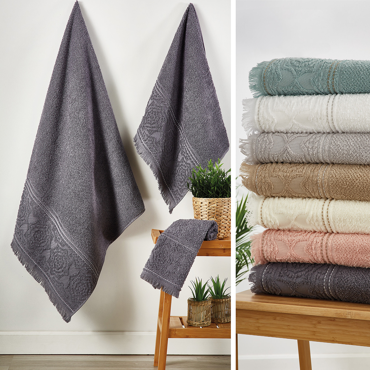 Σετ πετσέτες μπάνιου σε 7 αποχρώσεις με ανάγλυφο σχέδιο και κρόσια στο τελείωμα από την εταιρία Whitegg. Σύνθεση από 100% βαμβάκι βάρους 500gsm, που τις καθιστά απαλές και απορροφητικές. Συσκευασία κουτί.