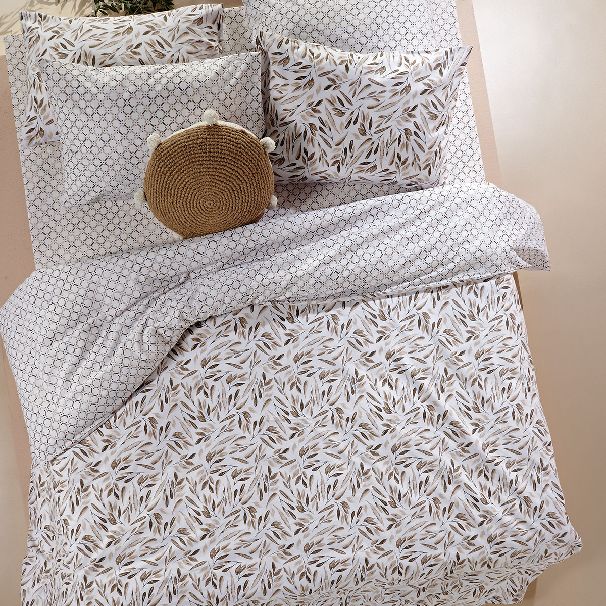Υπέρδιπλο κουβερλί από την εταιρεία Kentia. Έχει φλοράλ σχέδιο σε λευκό χρώμα με καφέ-μπεζ λεπτομέρειες. Το εξωτερικό ύφασμα είναι 100% βαμβάκι 150 κλωστών, απαλό και ανθεκτικό. Εσωτερικά έχει λεπτή πολυεστερική βάτα, που το καθιστά ιδανικό σκέπασμα για τους ανοιξιάτικους και καλοκαιρινούς μήνες. Είναι διπλής όψης, η μία μεριά έχει το σχέδιο του πανωσέντονου και η άλλη το σχέδιο του κατωσέντονου.