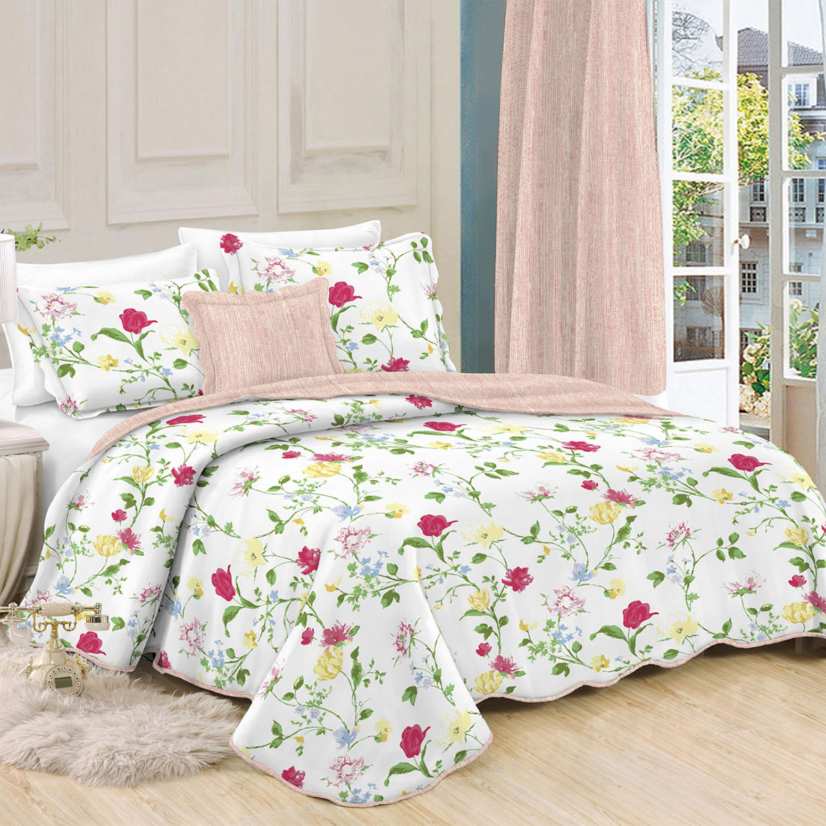 Μονό κουβερλί από την εταιρεία Viopros. Η μία πλευρά έχει λευκό φόντο και πολύχρωμο φλοράλ σχέδιο ενώ η άλλη έχει διακριτικό ριγέ σχέδιο σε κόκκινο-λευκό χρώμα. Η σύνθεσή του εξωτερικού υφάσματος είναι από 100% microfiber που το καθιστά ιδιαίτερα απαλό ενώ η γέμιση είναι από πολυεστερική βάτα, βάρους 150gsm. Ιδανικό σκέπασμα για τους καλοκαιρινούς-ανοιξιάτικους μήνες. Στο σετ περιλαμβάνεται η μαξιλαροθήκη Oxford (με περιμετρικό πλαίσιο). **Το σχέδιο στην μαξιλαροθήκη ενδέχεται να διαφέρει από αυτό της φωτογραφίας καθώς η εταιρεία παράγει μαξιλαροθήκες από όλο το σχέδιο του υφάσματος και τις συσκευάζει με τυχαία σειρά**