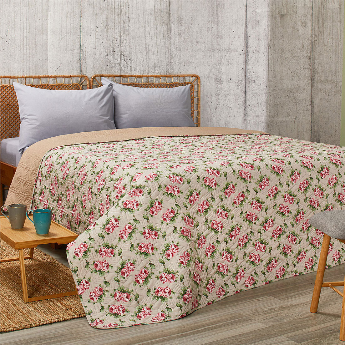Κουβερλί μονό διπλής όψης με καπιτονέ ανάγλυφο σχέδιο σε μπεζ χρώμα με ροζ-πράσινες λεπτομέρειες και φλοράλ σχέδιο από την εταιρεία Whitegg. Το εξωτερικό του ύφασμα είναι από 100% polyester και εσωτερικά διαθέτει λεπτή πολυεστερική βάτα. Η μία πλευρά είναι φλοράλ και η άλλη είναι μονόχρωμη ανοιχτό καφέ.