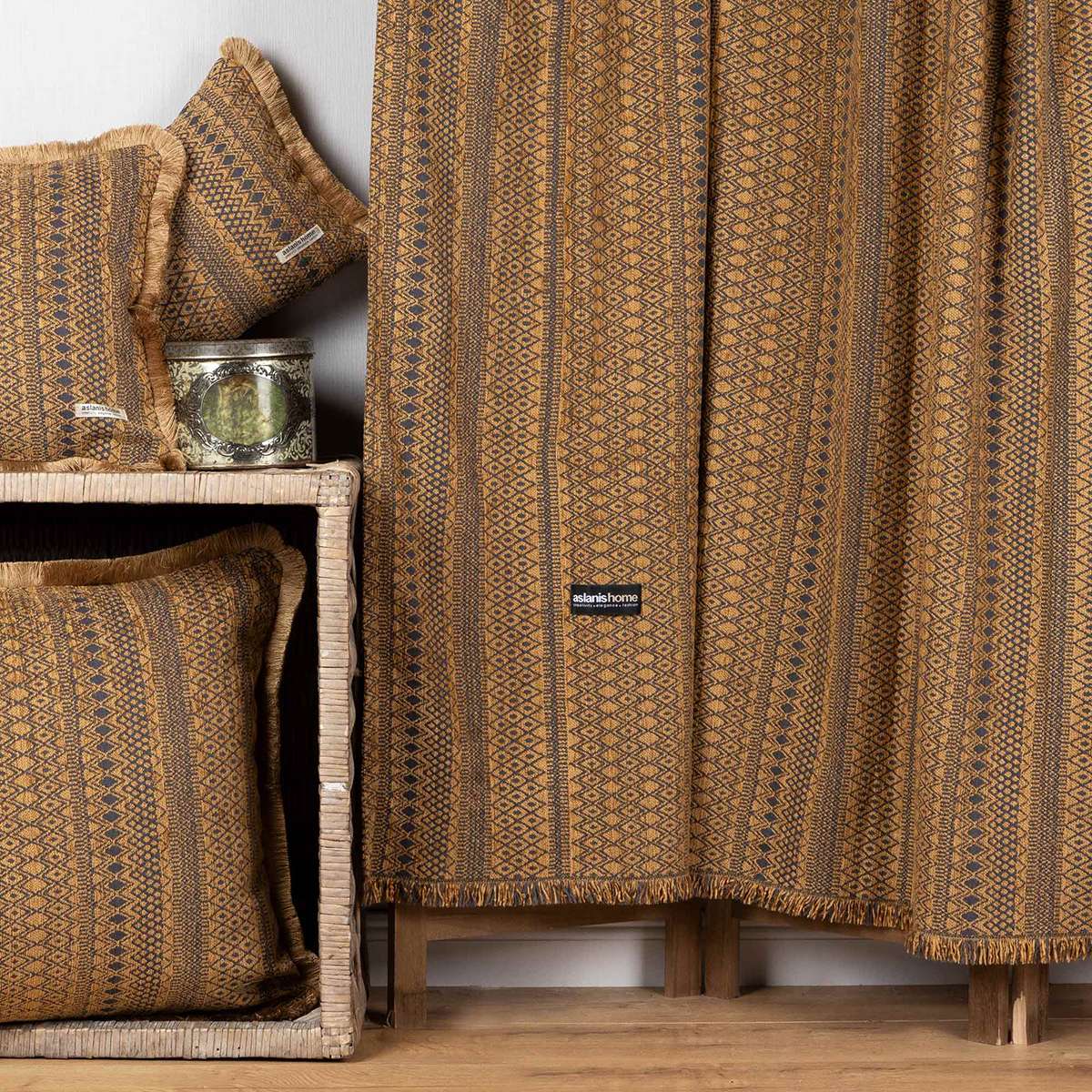 Ριχτάρι για τριθέσιου καναπέ σε χρυσό χρώμα, με καφέ-γκρι σκούρες λεπτομέρειες και έθνικ σχέδιο από την εταιρεία Aslanis Home. Το ύφασμα είναι chenille με σύνθεση 44% polycotton 36% βαμβάκι 20% πολυαιθυλένιο με ζακάρ ύφανση, που το καθιστά ιδανικό για τους χειμερινούς μήνες. Διαθέτει διακοσμητικά κρόσσια στο τελείωμα. Συνδυάστε το με τα υπόλοιπα είδη της ίδιας σειράς για ένα ολοκληρωμένο αποτέλεσμα.