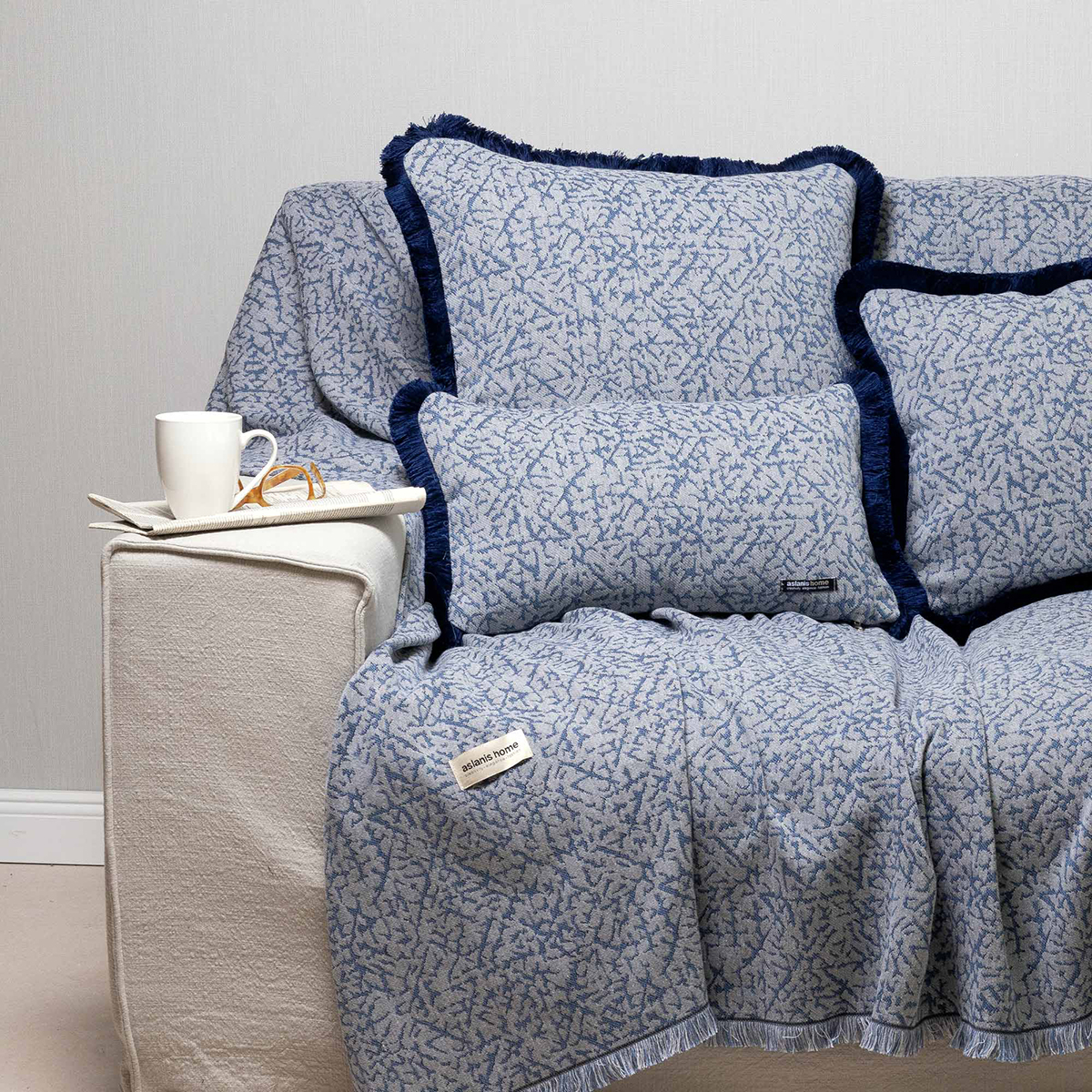 Ριχτάρι για τετραθέσιο καναπέ σε μπλε χρώμα, με γκρι λεπτομέρειες και μοντέρνο σχέδιο από την εταιρεία Aslanis Home. Το ύφασμα είναι chenille με σύνθεση 75% βαμβάκι 25% polyester με ζακάρ ύφανση, που το καθιστά ιδανικό για τους χειμερινούς μήνες. Διαθέτει διακοσμητικά κρόσσια στο τελείωμα. Συνδυάστε το με τα υπόλοιπα είδη της ίδιας σειράς για ένα ολοκληρωμένο αποτέλεσμα.