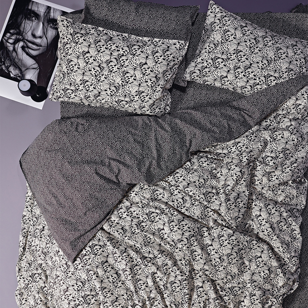 Σετ υπέρδιπλη παπλωματοθήκη από την εταιρεία Kentia. Έχει μοντέρνο σχέδιο σε λευκό-μαύρο χρώμα. Το ύφασμα είναι 100% βαμβάκι περκάλι 200 κλωστών, εξαιρετικής ποιότητας και φίνου νήματος, που προσφέρει πολύ απαλή υφή και ανθεκτικότητα. Είναι διπλής όψης, η μία μεριά έχει το σχέδιο του πανωσέντονου και η άλλη το σχέδιο του κατωσέντονου. Οι μαξιλαροθήκες έχουν το σχέδιο του πανωσέντονου και περιμετρικό πλαίσιο (τύπος Oxford).