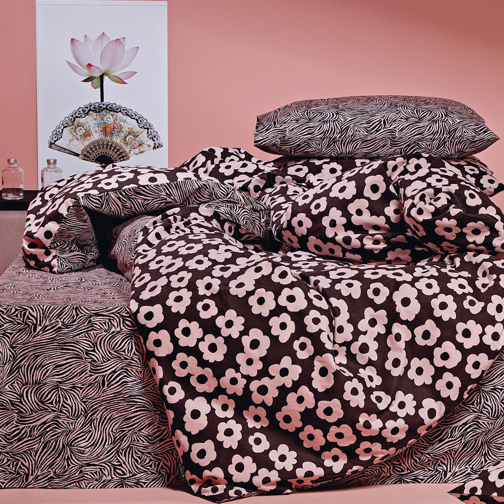 Σετ υπέρδιπλη παπλωματοθήκη από την εταιρεία Kentia. Έχει φλοράλ σχέδιο σε καφέ-ροζ χρώμα. Το ύφασμά είναι 100% βαμβάκι 150 κλωστών, απαλό και ανθεκτικό. Είναι διπλής όψης, η μία μεριά έχει το σχέδιο του πανωσέντονου και η άλλη το σχέδιο του κατωσέντονου. Οι μαξιλαροθήκες είναι φάκελος με το σχέδιο του πανωσέντονου.