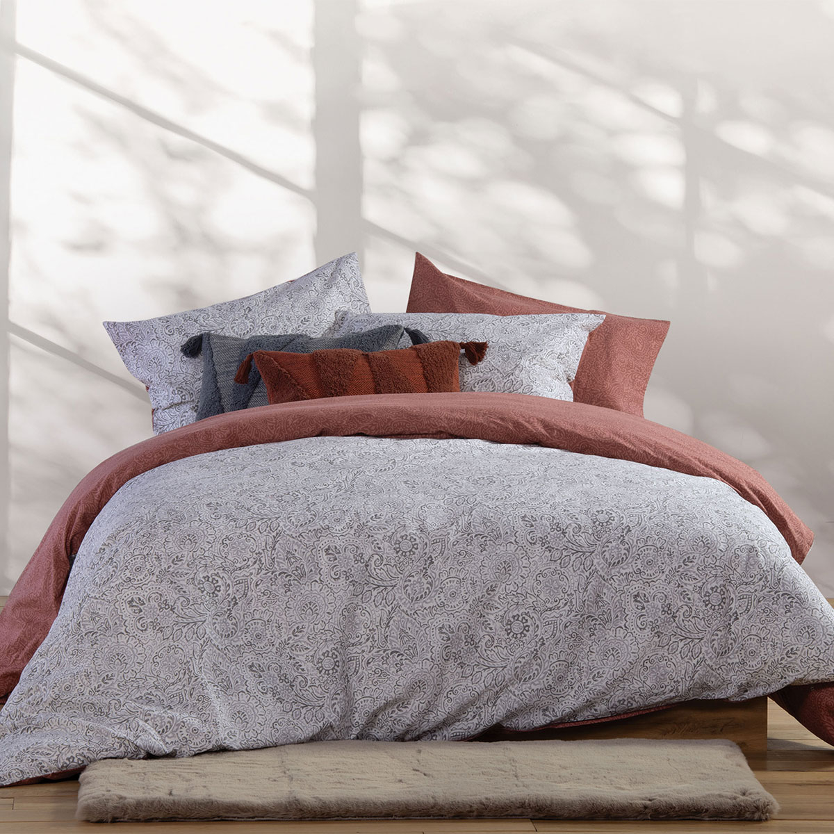 Παπλωματοθήκη υπέρδιπλη σετ της εταιρείας Nef-Nef σε γκρι αποχρώσεις με φλοράλ σχέδιο. Είναι κατασκευασμένη από 100% βαμβάκι 144 κλωστών, που προσφέρει απαλότητα και ανθεκτικότητα. Η παπλωματοθήκη και οι μαξιλαροθήκες είναι διπλής όψης αφού από την μια πλευρά έχει το σχέδιο του πανωσέντονου ενώ η άλλη το σχέδιο του κατωσέντονου. Κλείνει με φερμουάρ στο κάτω μέρος.