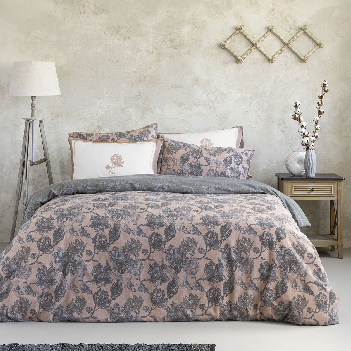 Σετ υπέρδιπλη φανελένια παπλωματοθήκη από την εταιρεία Nima σε μπεζ και γκρι αποχρώσεις με φλοράλ σχέδιο. Το ύφασμα είναι φανελένιο 100% βαμβακερό ύφασμα, που προσφέρει απαλότητα και ζεστασιά τους χειμερινούς μήνες. Στο κάτω μέρος κλείνει με φερμουάρ. Οι μαξιλαροθήκες είναι φάκελος διπλής όψης. Η παπλωματοθήκη είναι διπλής όψης με τη μία μεριά να έχει το σχέδιο του πανωσέντονου και την άλλη του κατωσέντονου. Συσκευασία σε υφασμάτινο πουγκί. *Το σχέδιο στις μαξιλαροθήκες ενδέχεται να διαφέρει από αυτό της φωτογραφίας καθώς η εταιρεία παράγει μαξιλαροθήκες από όλο το σχέδιο του υφάσματος και τις συσκευάζει με τυχαία σειρά.*